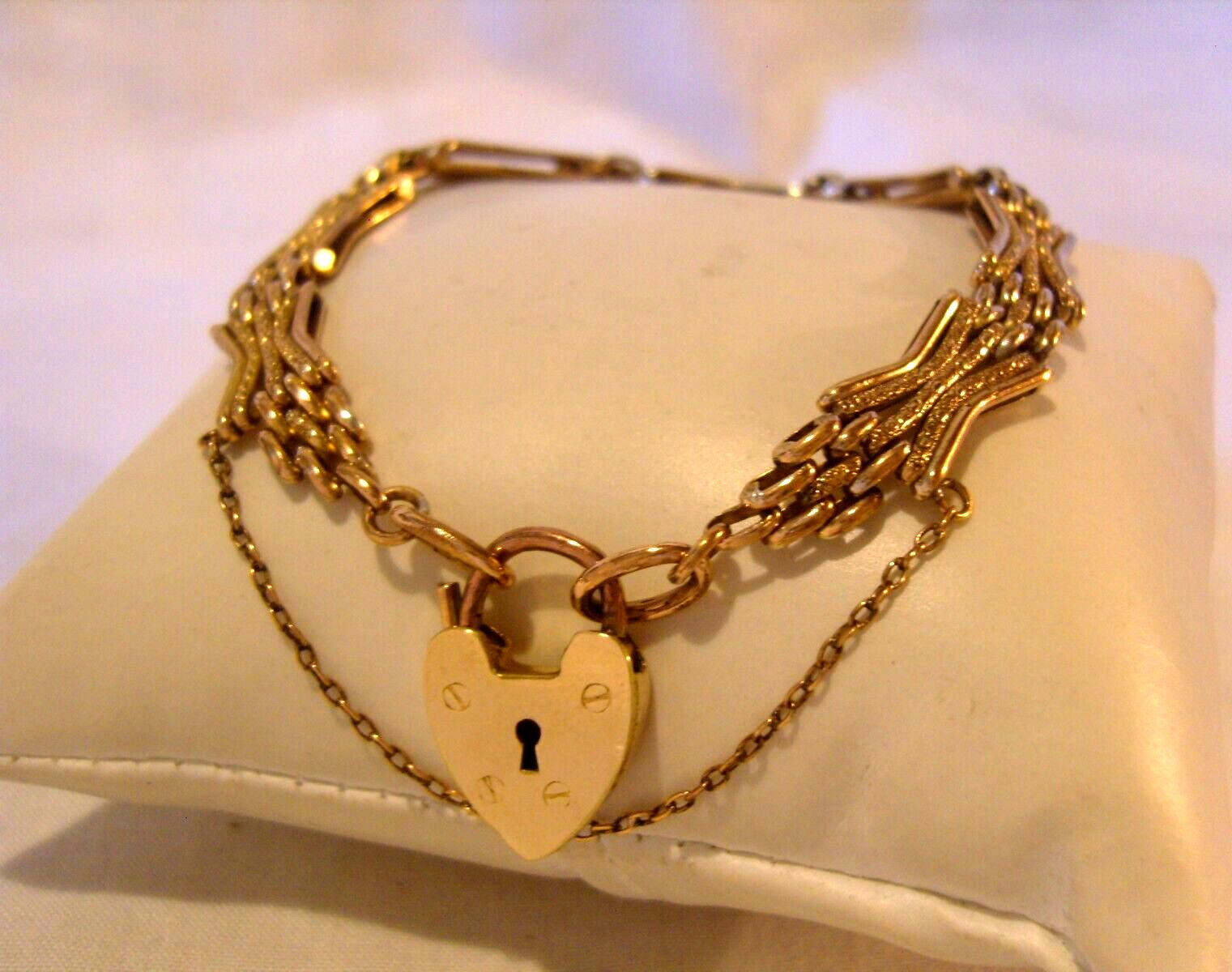 Victorian Gate Bracelet 1890s 12ct Rose Rolled Gold Love Heart Padlock 8" Length