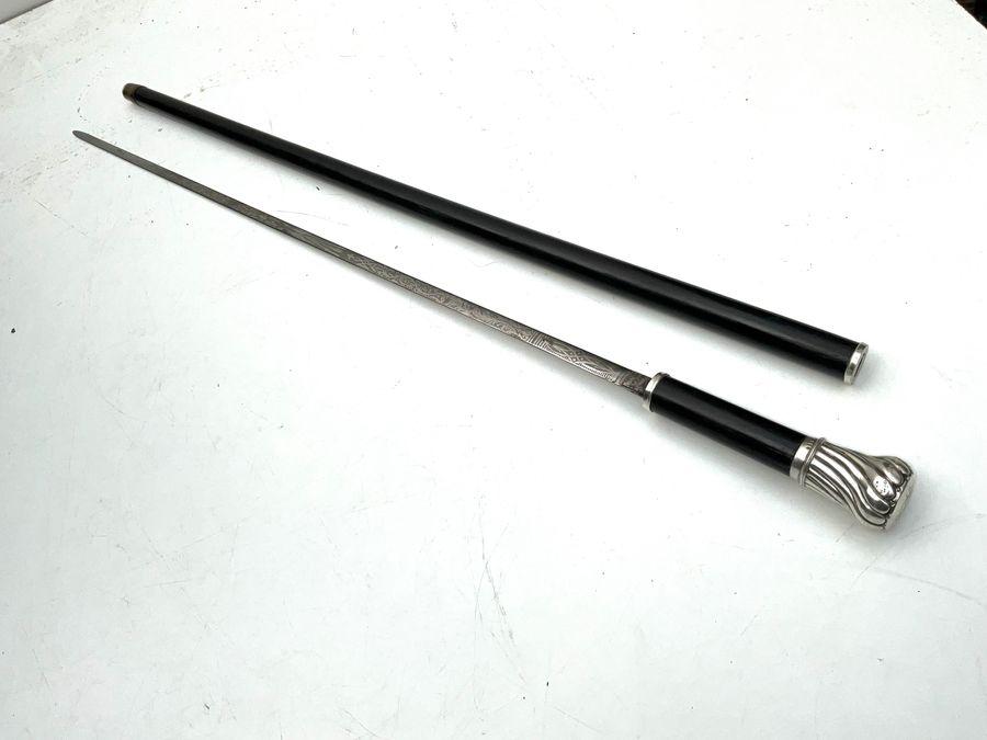 Handles hallmarked for London 1886 the blade has the famous name of Wilkinson & Son of Maddox street London West. Blades beautifully engraved with military overtones being crossed lances, double-edged blade in excellent condition as is the stick, overall length of 93 cm the superb silver grips diameter is 4 cm, sticks diameter from tops 27 mm tapering down to ferule is 2 cm, and from steels tip to top of silvers handle is 87 cm, offering free worldwide delivery, reference AK6 Tel: +44 7505 165 843 We accept online payments for all our items listed: Bank transfer cash on collection or if wishing over the phone using your debit or credit cards, also doing lay-by payments plan, or email giving your address details & contact number and we shall send you your items invoice to make payment with your card. Send your request to - john.strong2@gmail.com