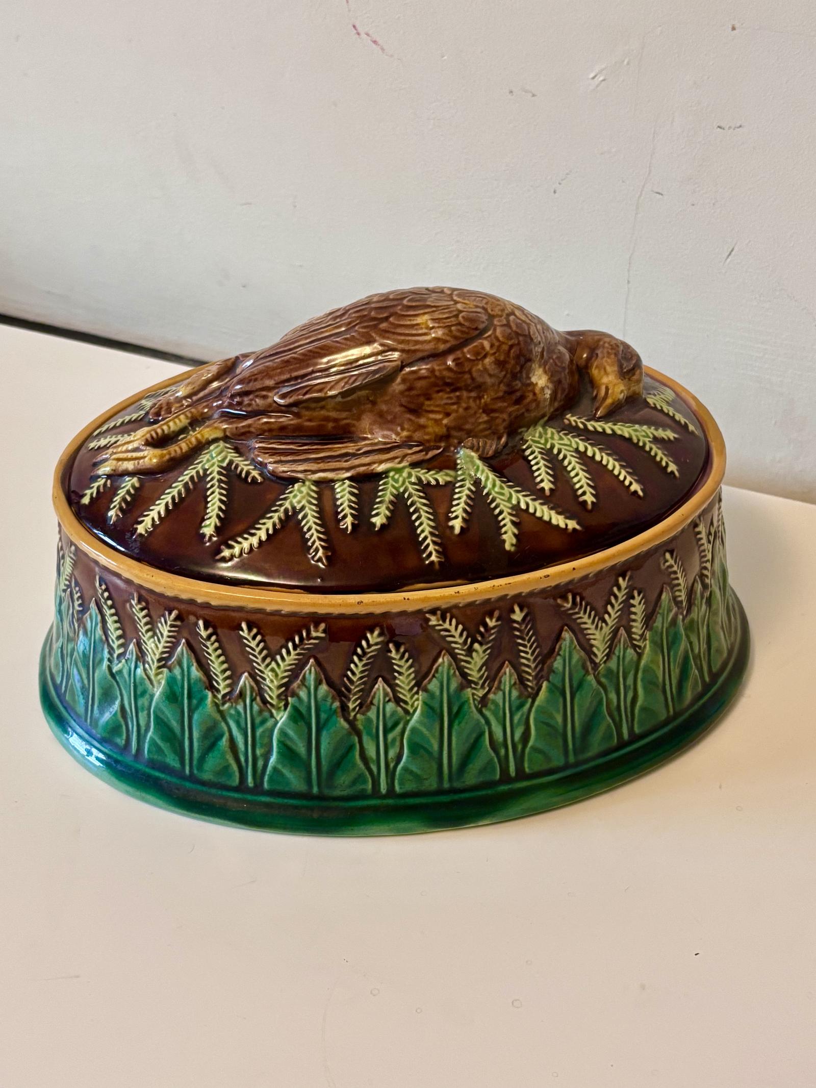 Victorian George Jones Majolica Game Pie Dish Tureen Partridge Bird Lid