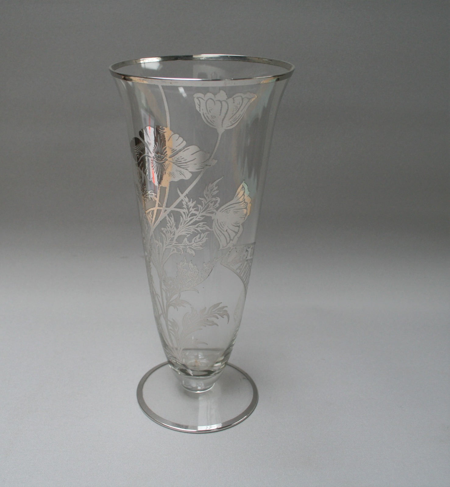 Victorian Glass Vase Which Has An Overlay of Silver Flowers