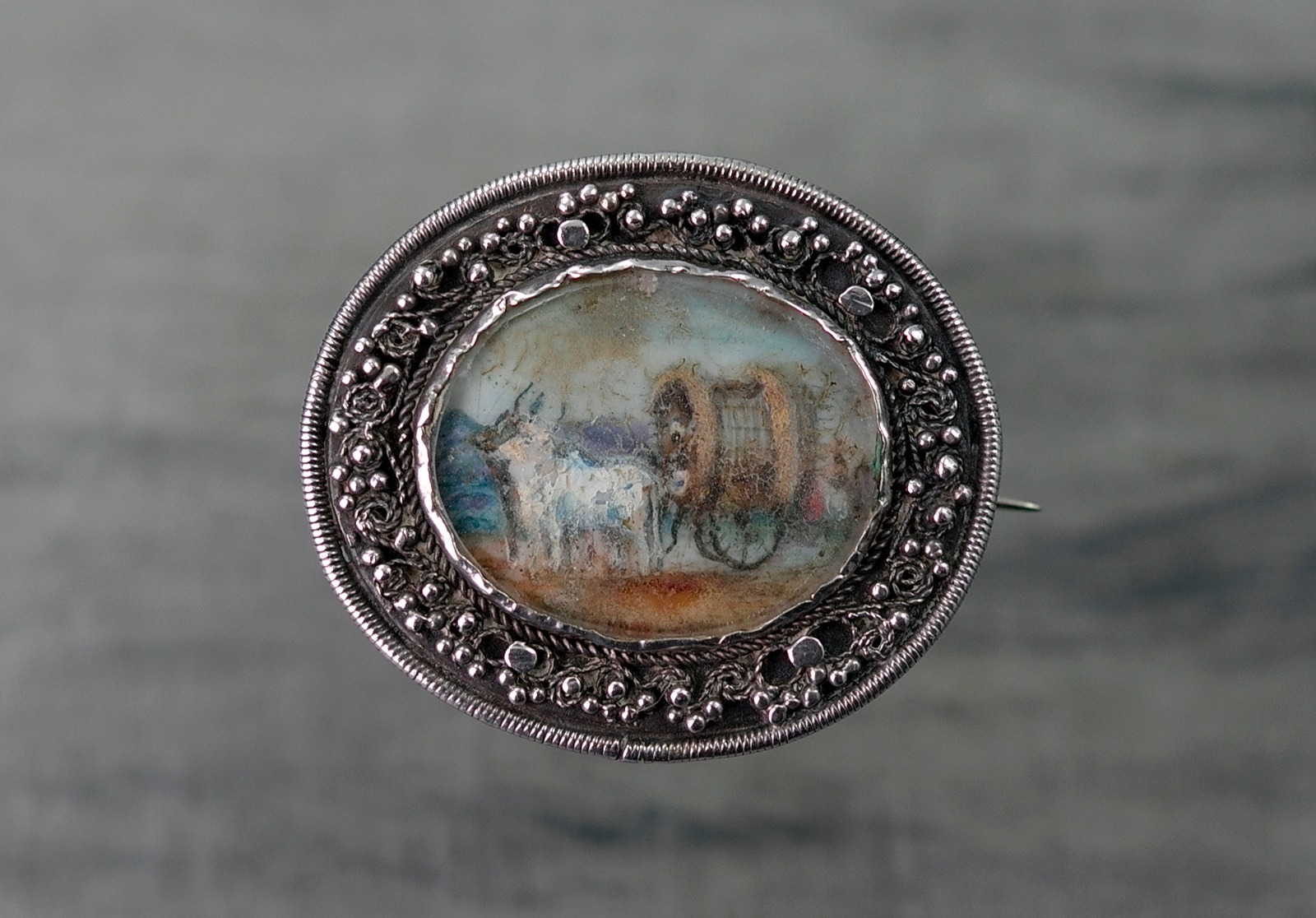 Victorian Indian Silver Hand Painted Miniature Brooch, Bullock Cart Landscape Pin, Antique