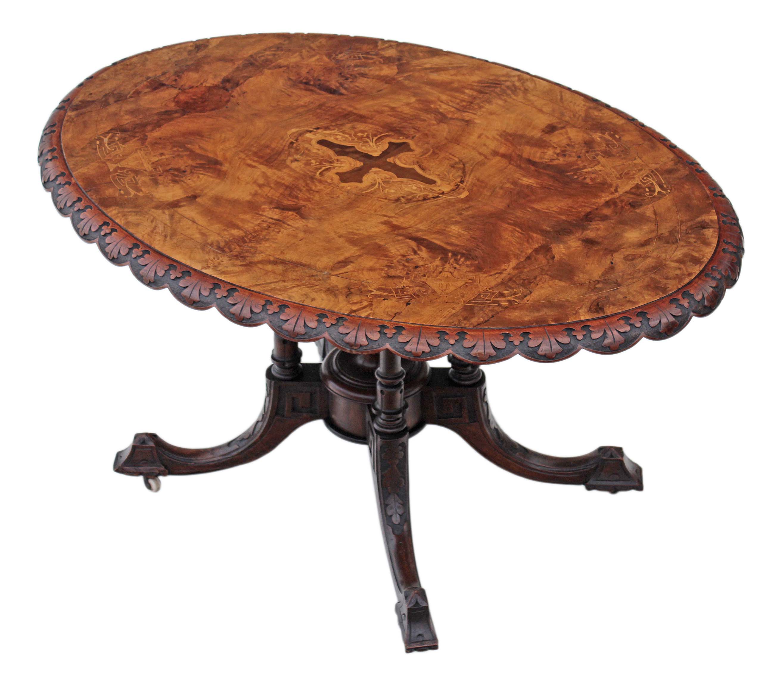Victorian Inlaid Burr Walnut Oval Loo / Breakfast Table / Tilt Top Table