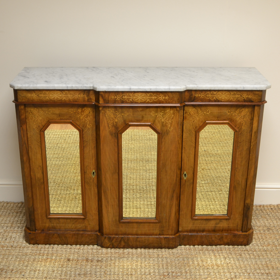 Victorian Inlaid Figured Walnut Antique Break-Fronted Credenza