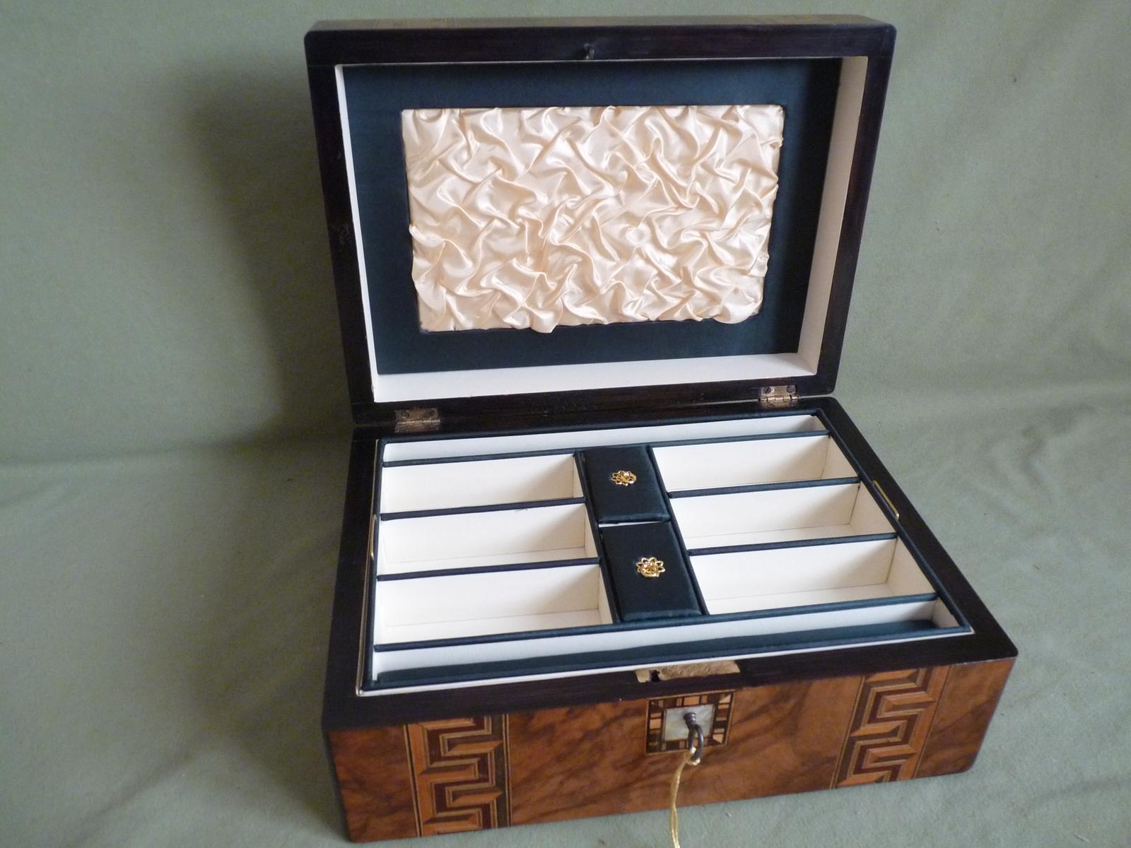 Victorian Inlaid Figured Walnut Jewellery Box + Tray - Plush Interior c.1880