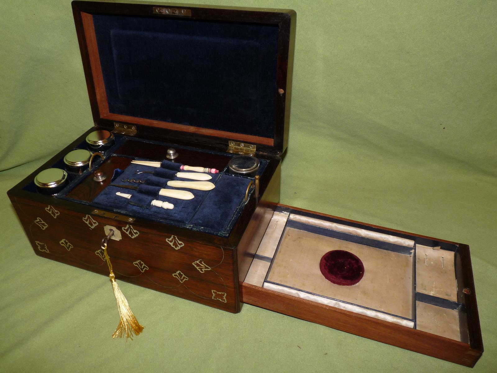 Victorian Inlaid Rosewood Jewellery Box. Side Drawer + Tray. C1860
