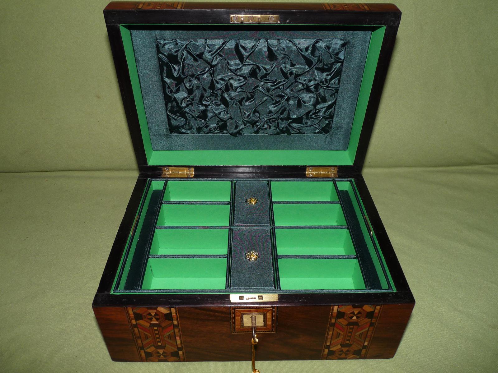 Victorian Inlaid Walnut Tunbridge Ware Style Jewellery Box + Tray c.1880