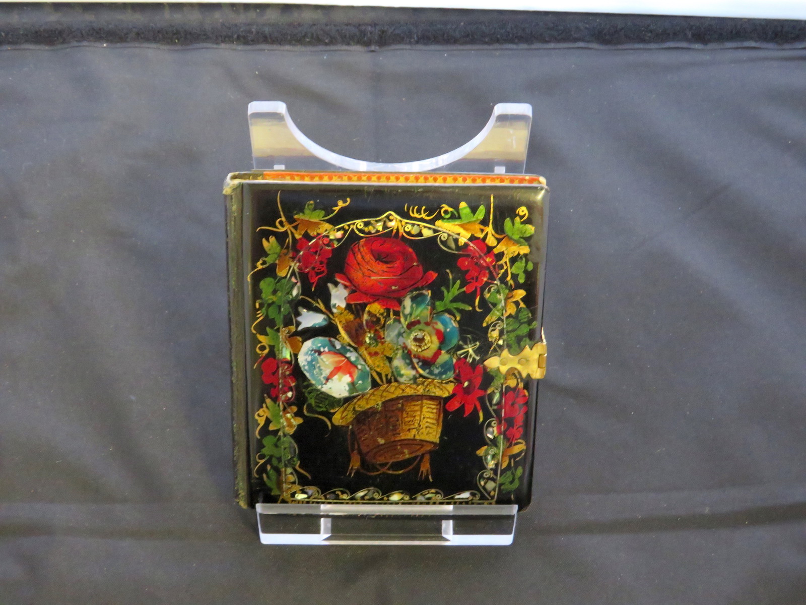 Victorian Lacquered Wood Photograph Frame Case, Painted Basket of Flowers, circa Mid 19th Century