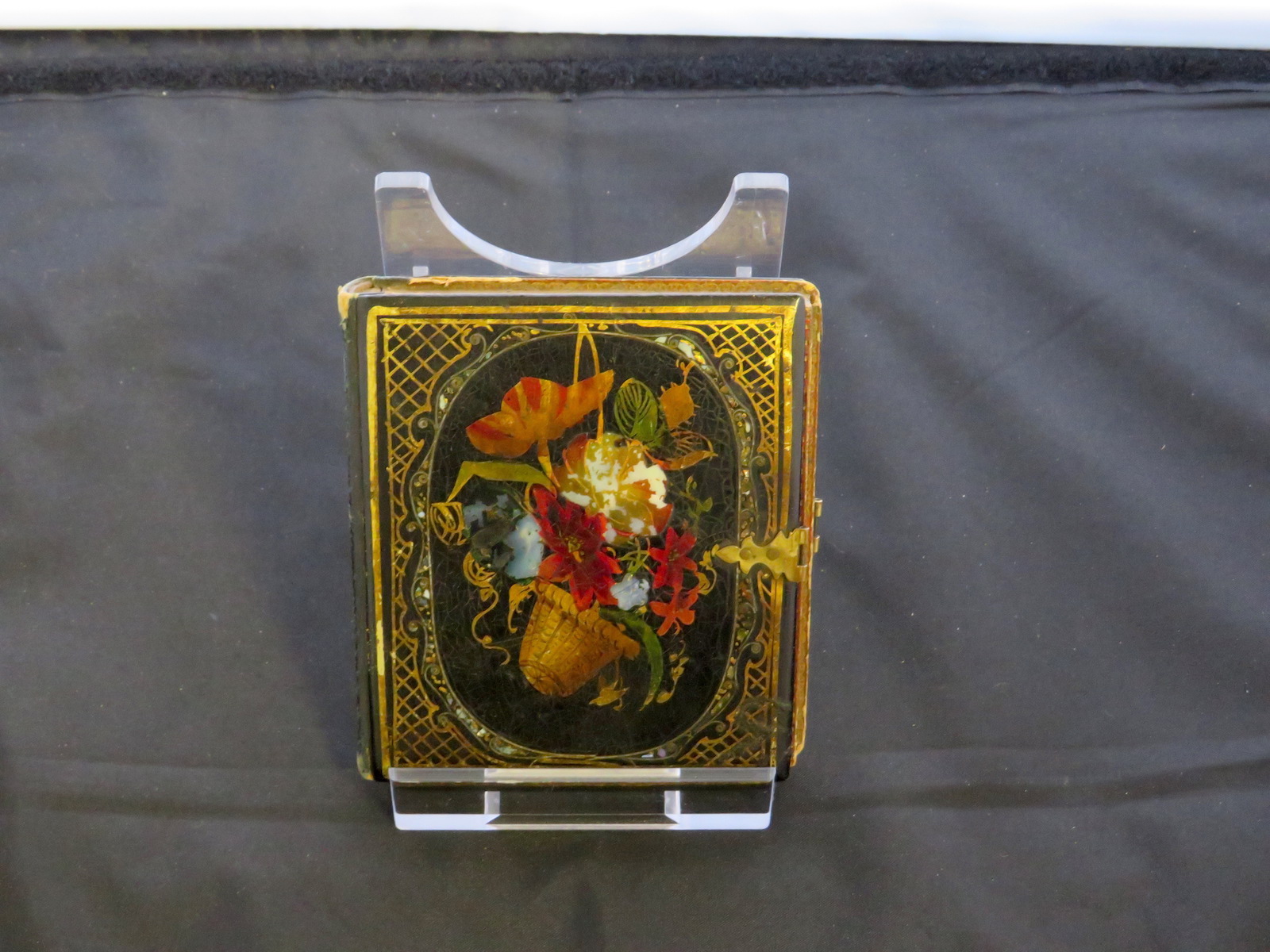 Victorian Lacquered Wood Photograph Frame Case, Painted Basket of Flowers, Mid 19th Century