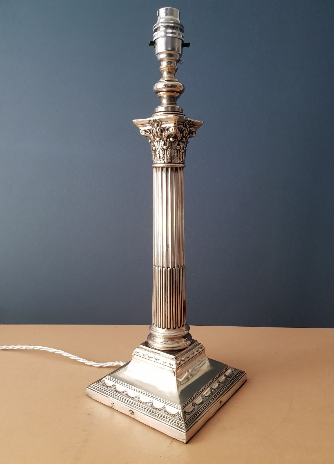 Victorian Large Silver Plated Corinthian Column Table Lamp, Rewired & Pat Tested