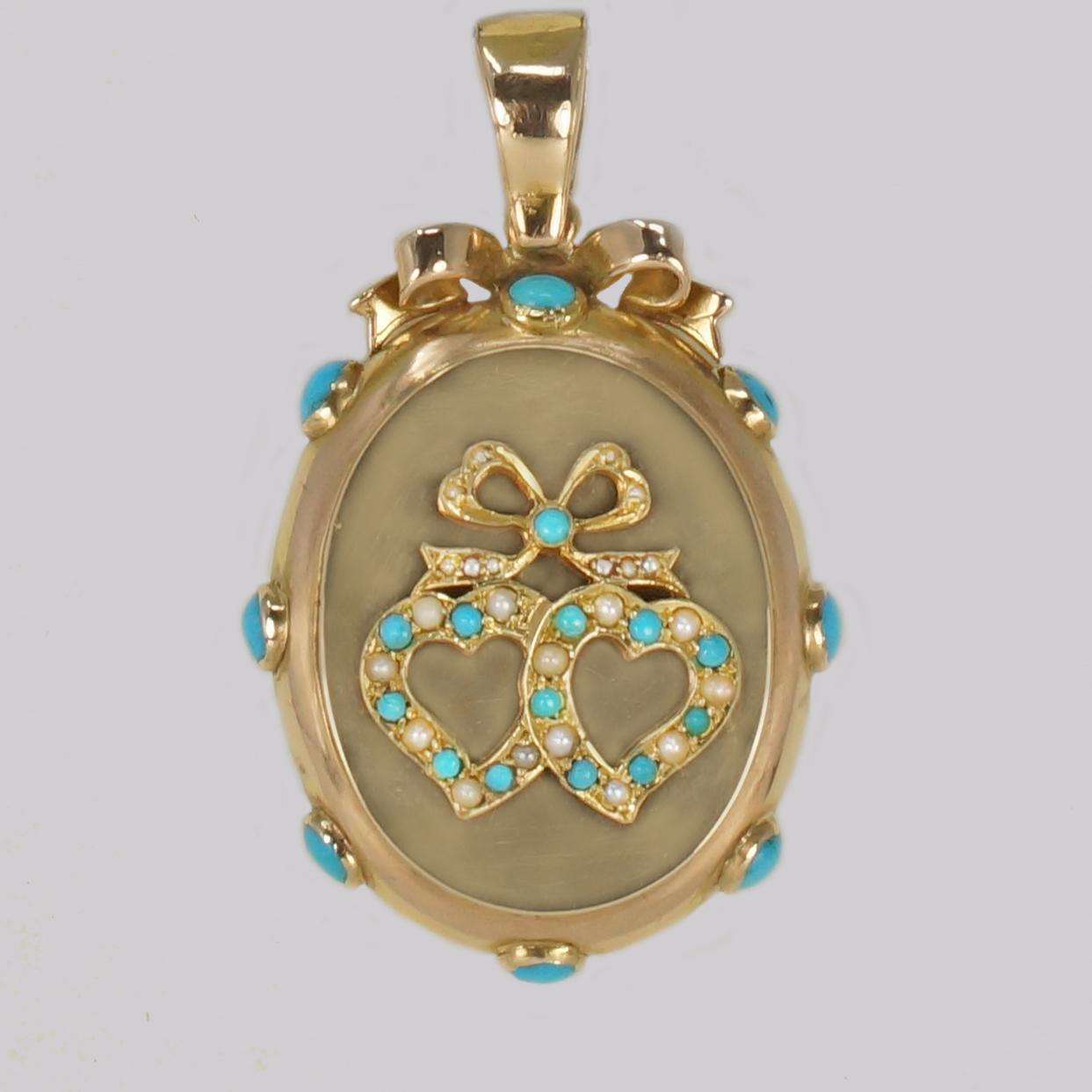 Victorian Locket Turquoise & Pearl 18ct Gold Photo Locket Witches Heart Pendant c.1880