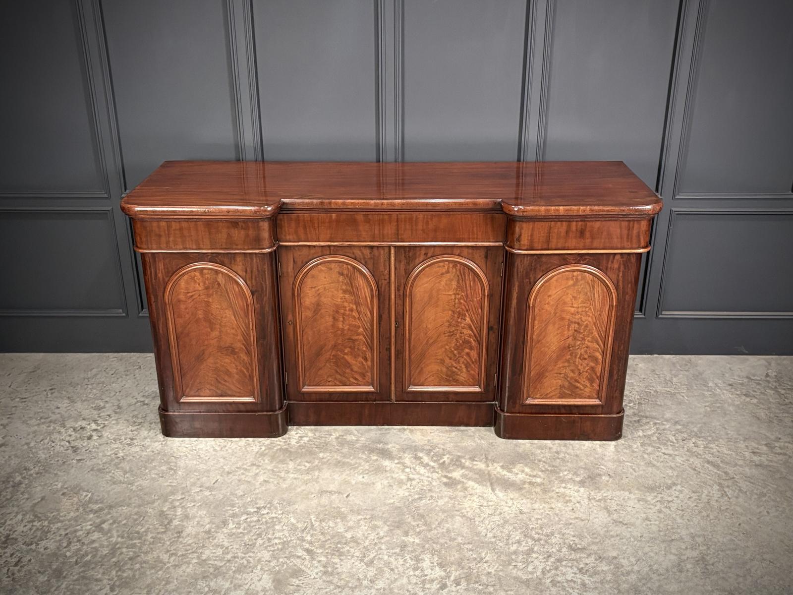A fine quality Victorian mahogany sideboard of elegant inverted breakfront form, showcasing beautiful flame mahogany throughout.
