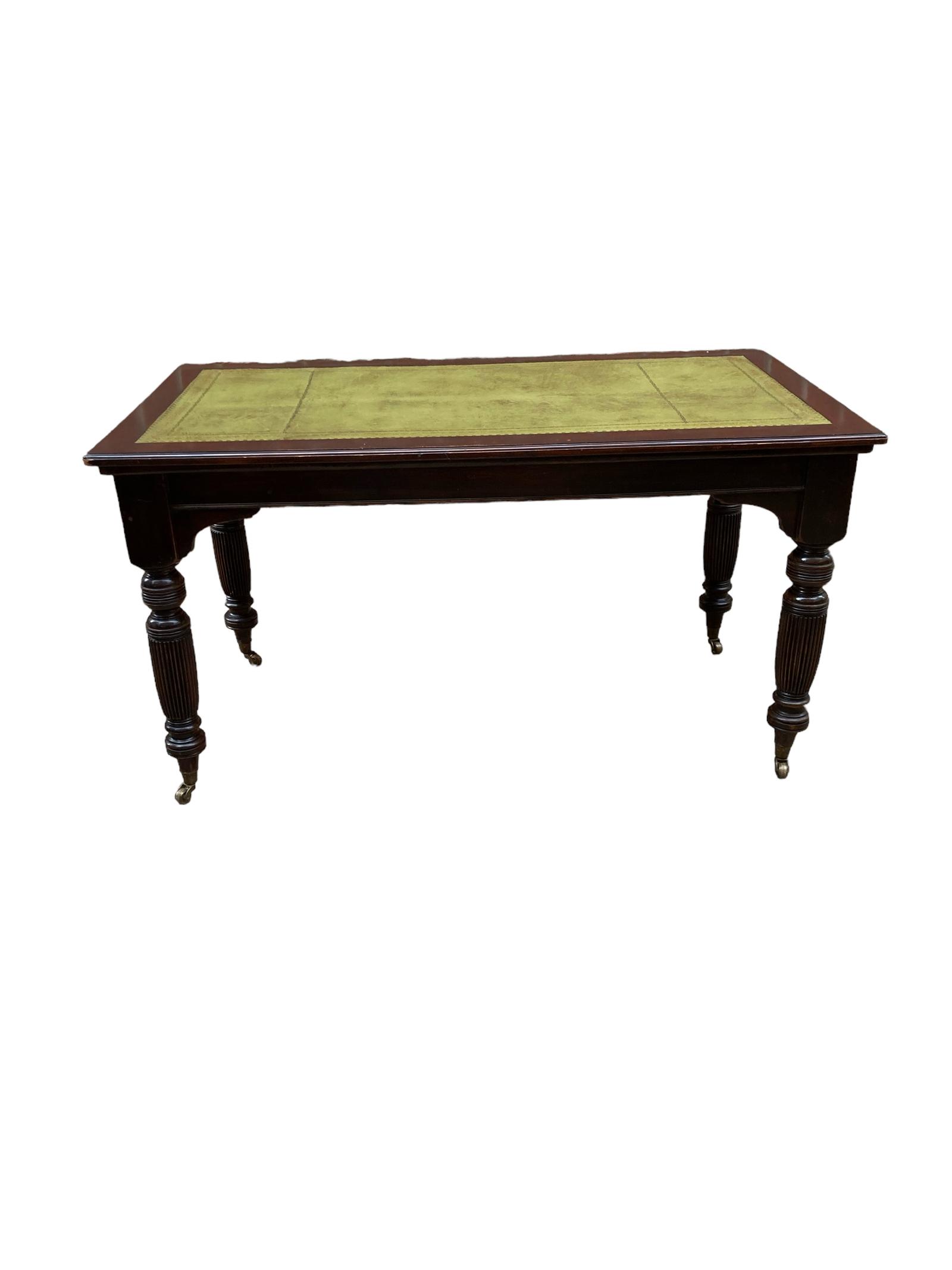 Victorian Mahogany Library / Writing Table, Fluted Carved Legs on Casters, Olive Green Leather Top