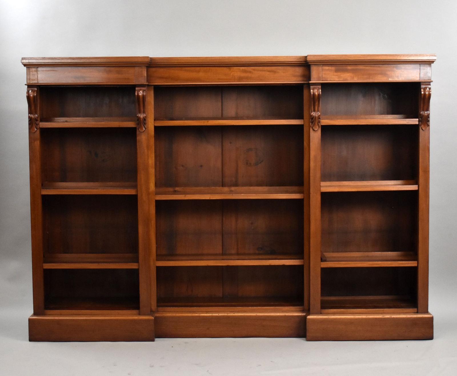The central section is flanked by slightly projecting end bays, each supported by finely carved corbels beneath the cornice. The bookcase retains its original adjustable shelving throughout, providing generous and versatile display space, while the stepped plinth base and moulded cornice complete the elegant architectural form. A superb example of Victorian craftsmanship, ideal for a library, study, or refined interior.