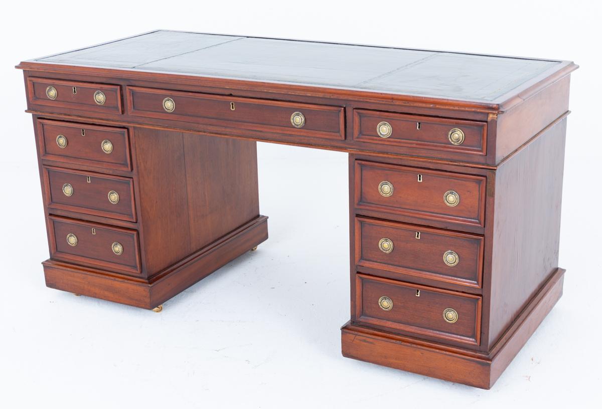 An exceptional Victorian partners desk of generous proportions, crafted in richly figured mahogany of outstanding quality. The front is fitted with an arrangement of nine finely constructed, mahogany-lined drawers, each retaining its original brass ring pull handles, all demonstrating superb craftsmanship and attention to detail.