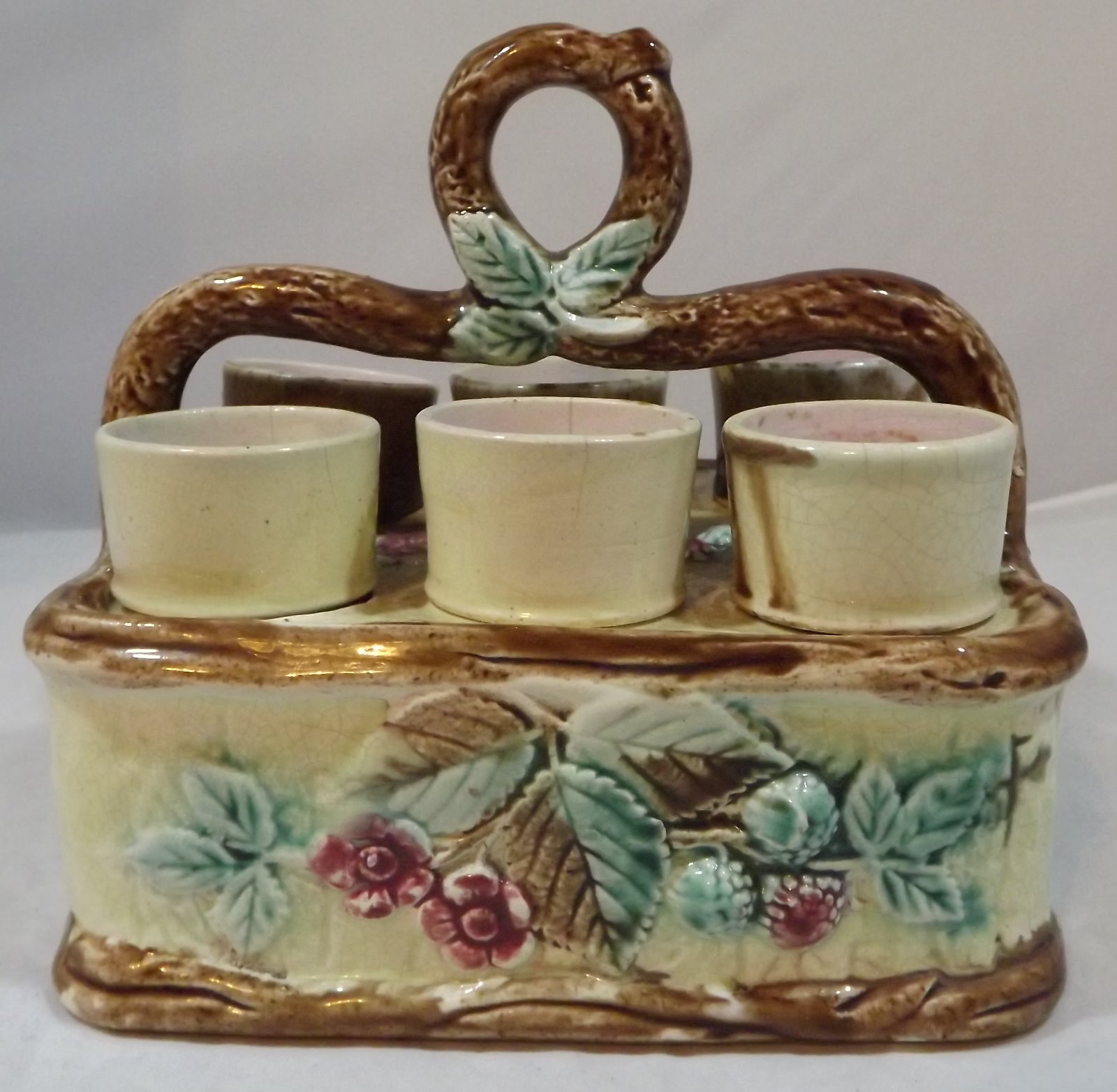 Victorian Majolica Egg Basket with Six Egg Cups