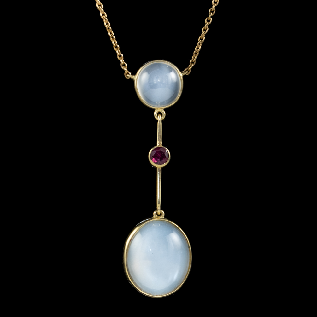 Victorian Moonstone Ruby Lavaliere Pendant Necklace 15ct Gold c.1900