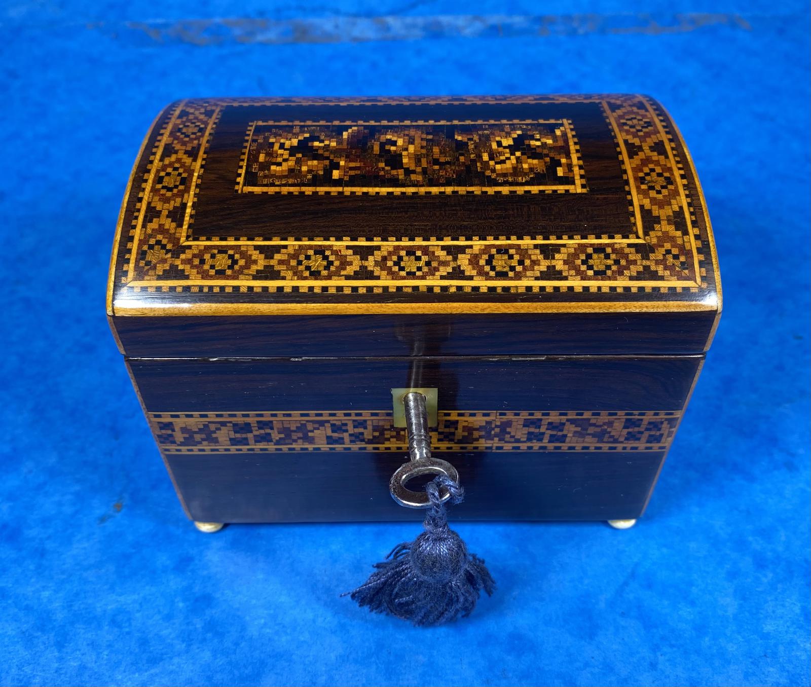 Victorian Mosaic Inlaid Rosewood Miniature Twin Tea Caddy
