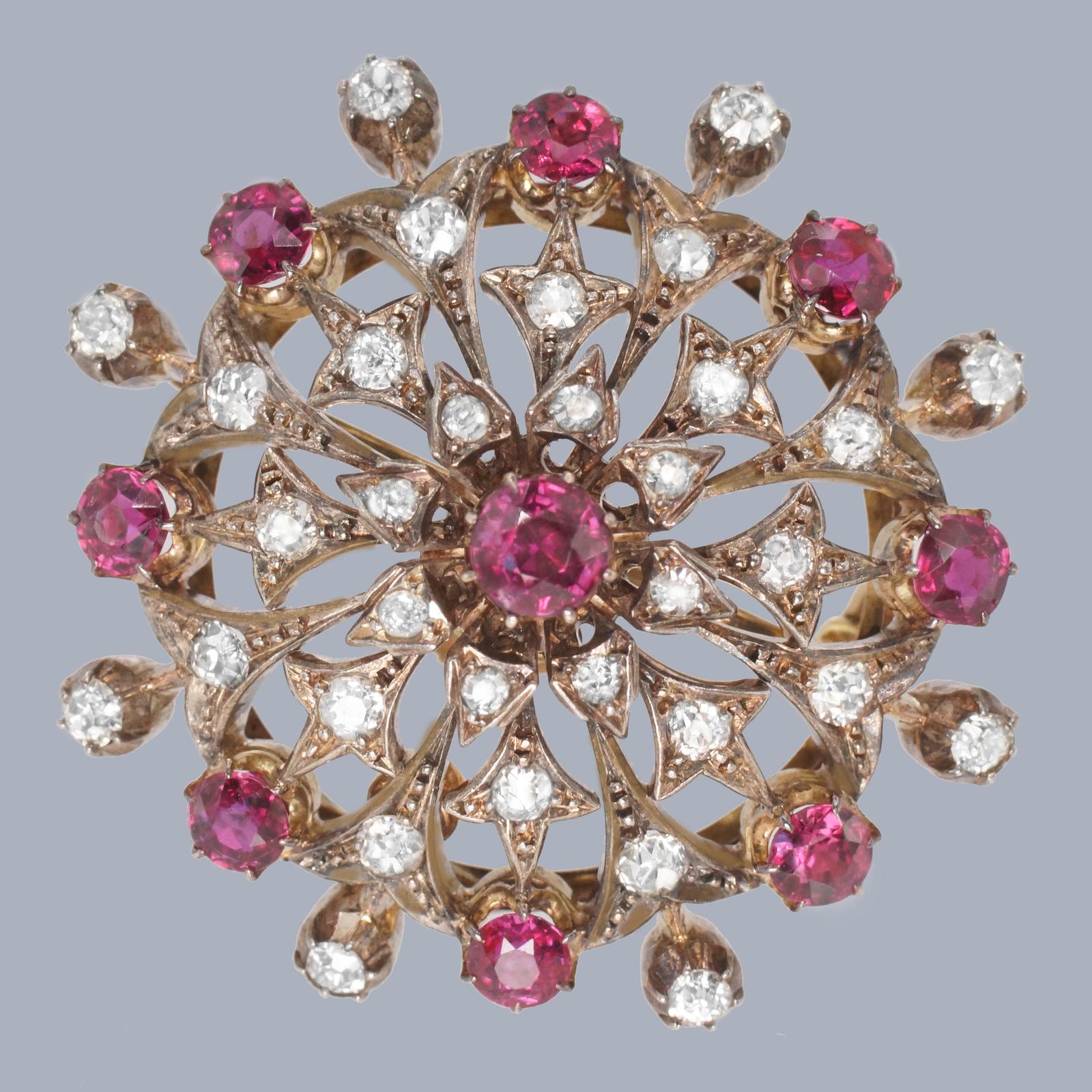 This beautifully crafted piece is designed as an elaborate radiating cluster, centred with a vivid ruby and surrounded by concentric layers of shimmering old cut diamonds. The design has a wonderful sense of movement and light, typical of the finest late Victorian jewellery.