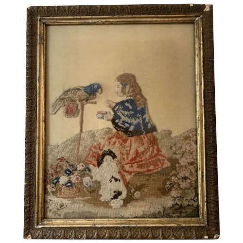Victorian Needlework Panel of Girl, Parrot & Spaniel