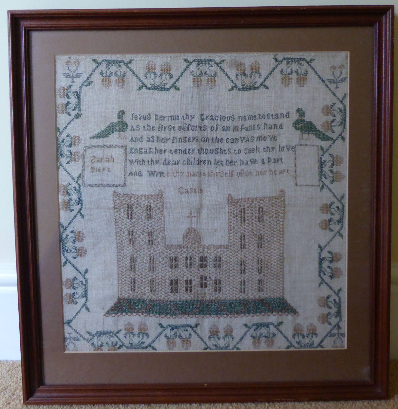 Victorian Needlework Sampler Sarah Piert Castle & Peacocks with Verse