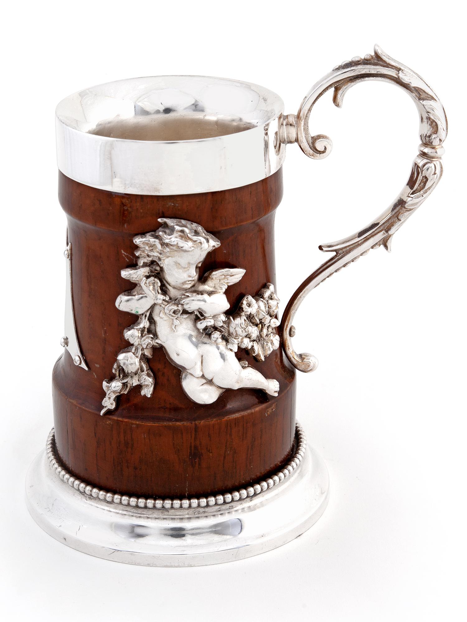 Victorian Oak and Silver Plate Pint Tankard Decorated with Two Winged Cherubs