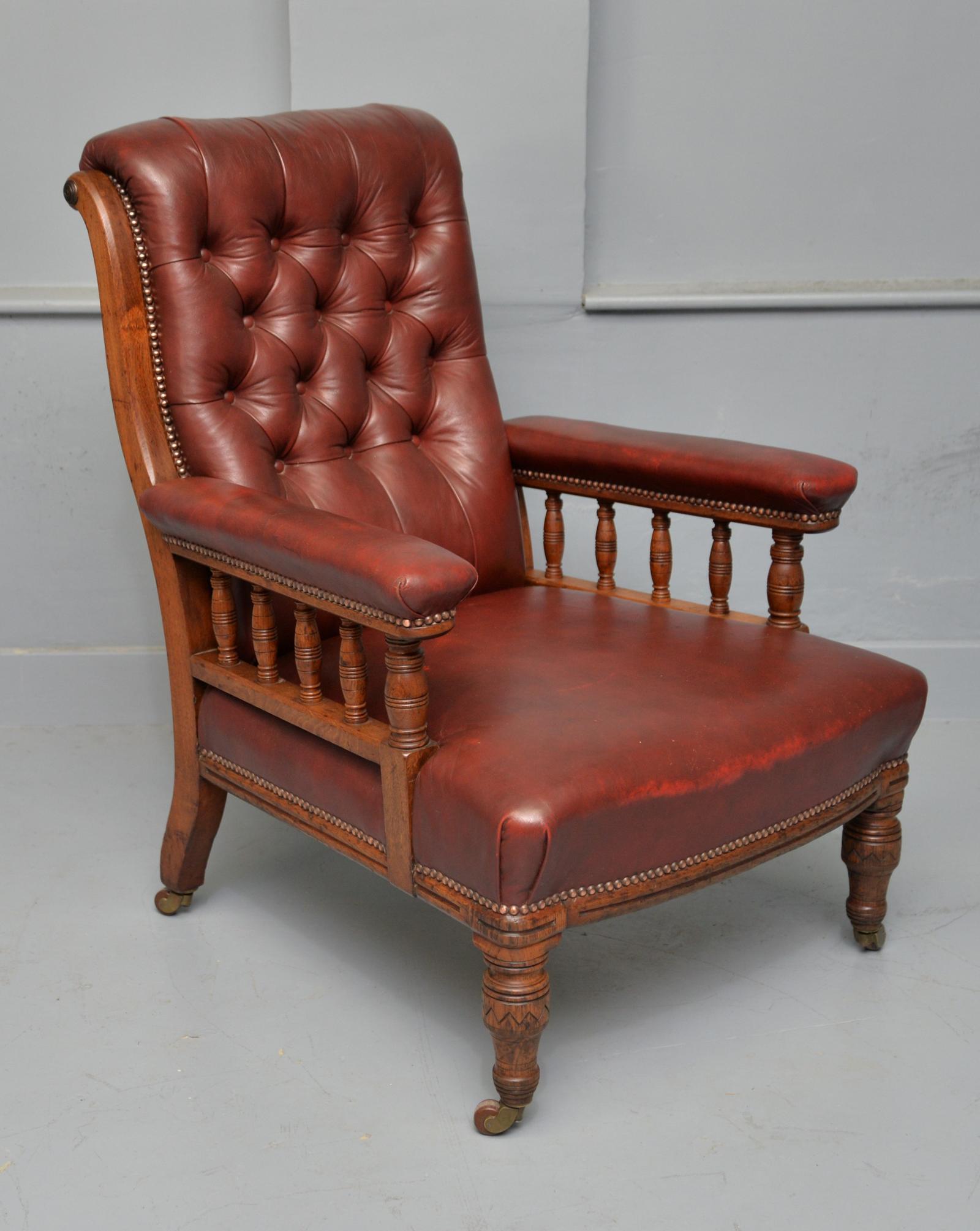Victorian Oak Frame Red Leather Library, Occasional, Easy Armchair