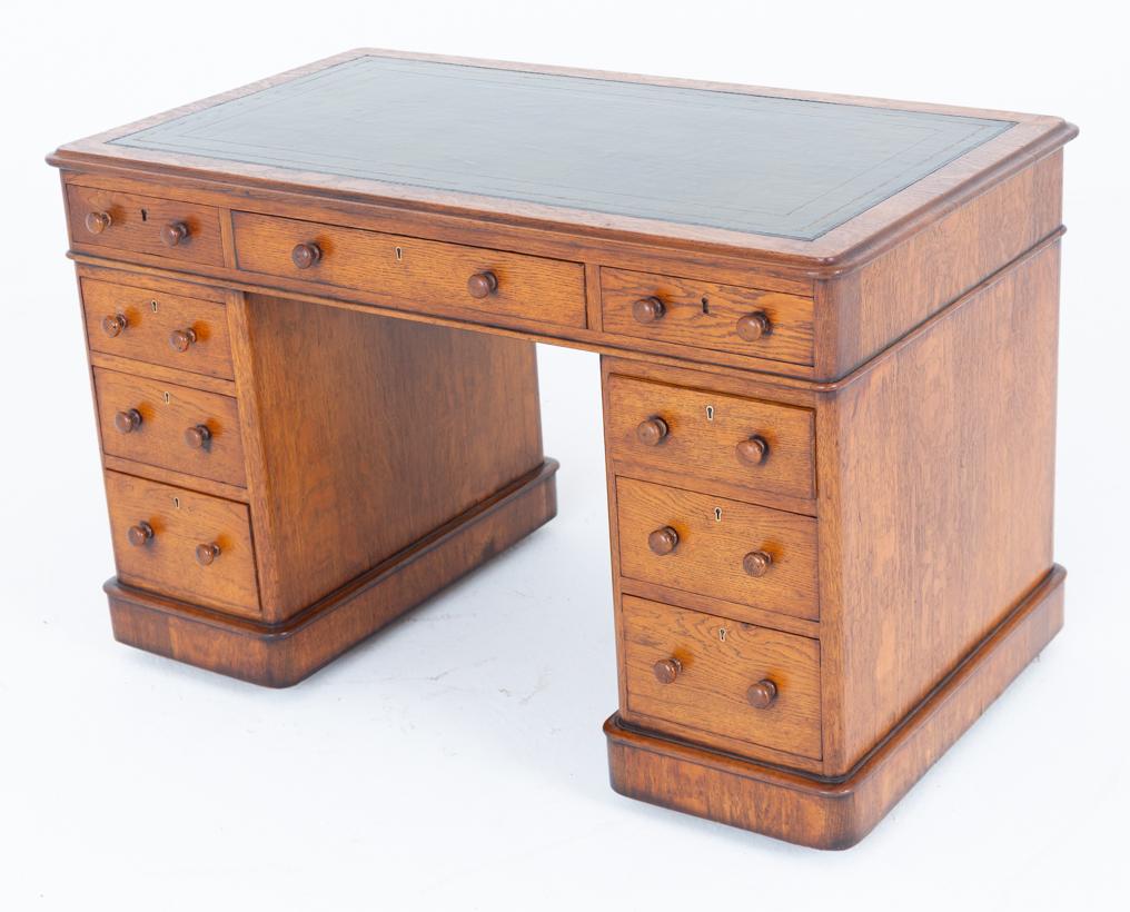 A distinguished Victorian oak pedestal desk of exceptional quality and generous proportions, presented in the desirable free-standing form.