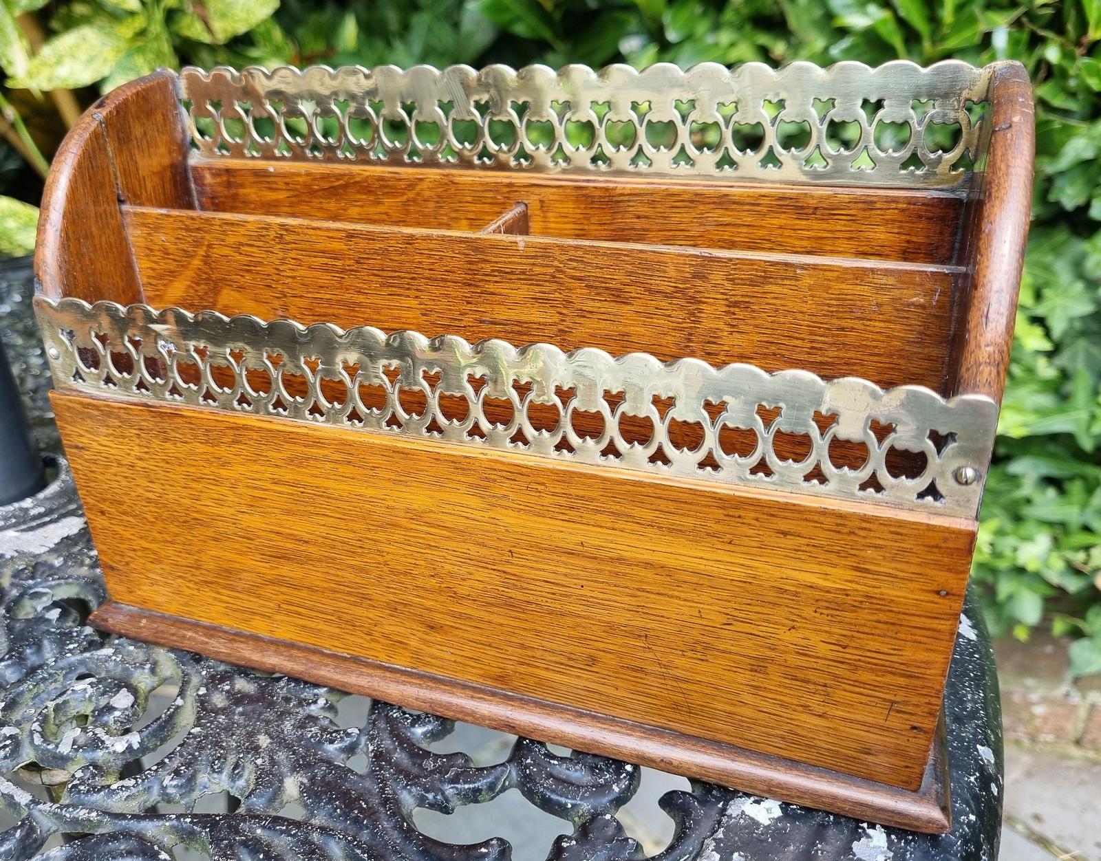 Victorian Oak & Pierced Brass Letter Rack 9"