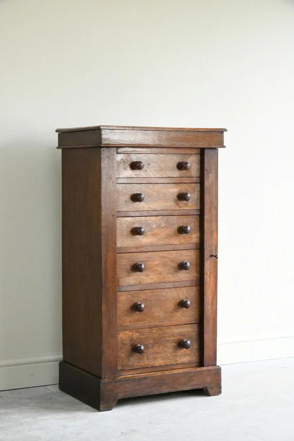 Victorian Oak Wellington Chest. A compact Victorian oak Wellington chest of tall, narrow proportions, designed for secure and practical storage. The chest is fitted with a graduated arrangement of six drawers, each retaining turned wooden knob handles, and is enclosed by a locking side bar, secured with a key. A classic and functional 19th century piece, ideal for a bedroom, hallway, or study.
