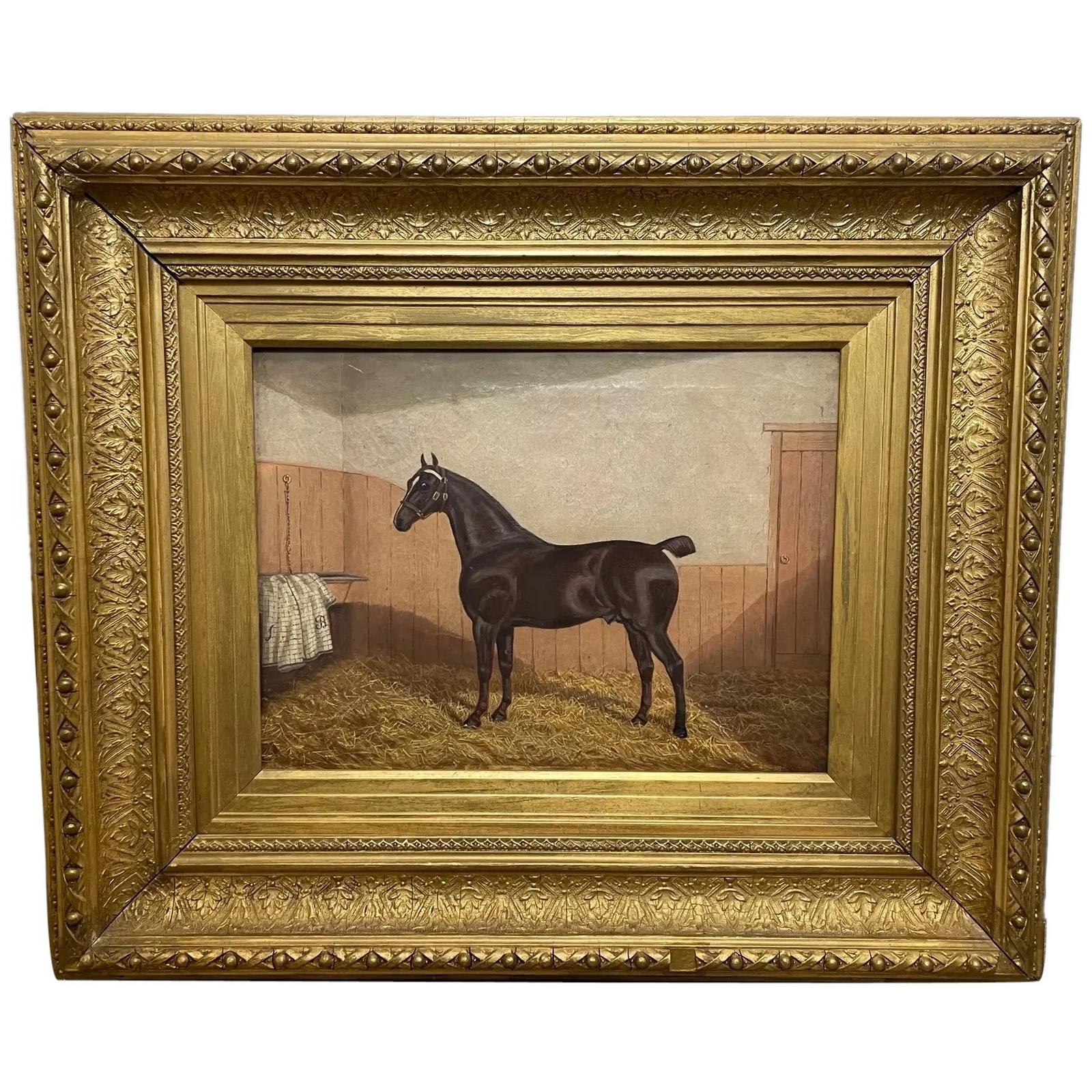 Victorian Oil Painting Bay Hunter Horse in Stable by Albert Clark Snr 1821-1909