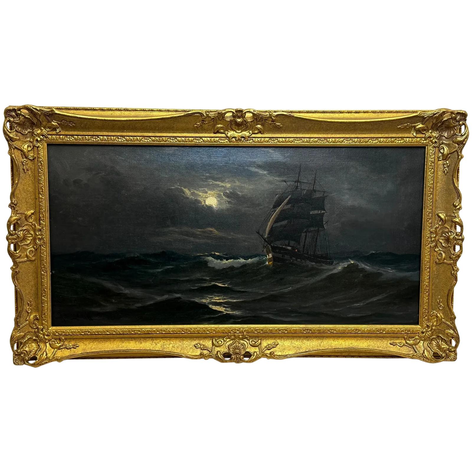 Victorian Oil Painting Marine Ship Sailing by Moonlight by John Davison Liddell
