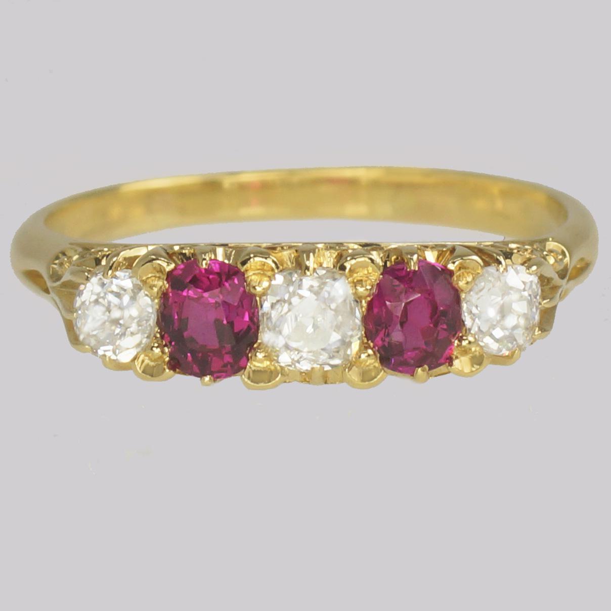 Victorian Old Mine Cut Diamond & Ruby Ring 18ct Gold Five Stone Antique Ring