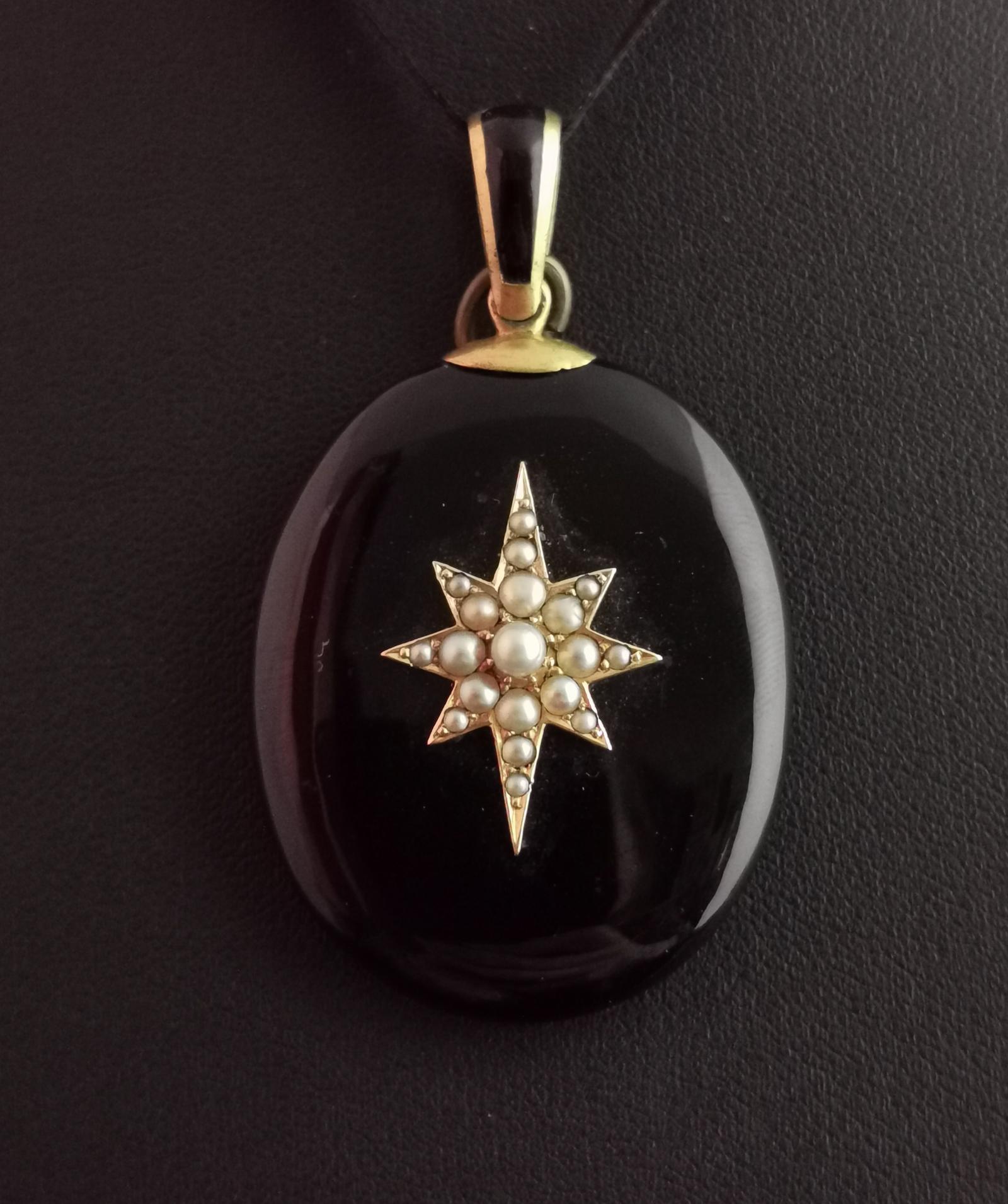 Victorian Onyx Mourning Locket, Seed Pearl Star, 15ct Gold