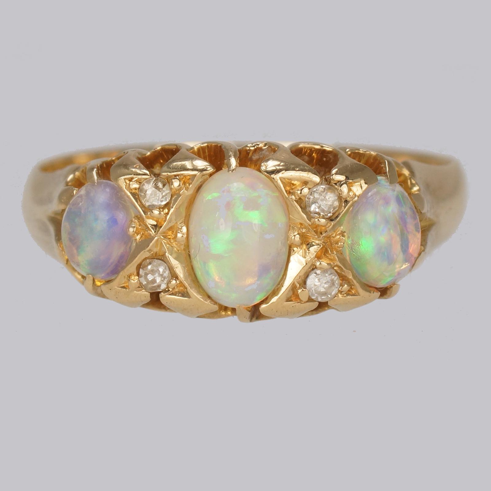 Victorian Opal & Old Cut Diamond Ring 18ct Gold Antique Trilogy Ring c.1890