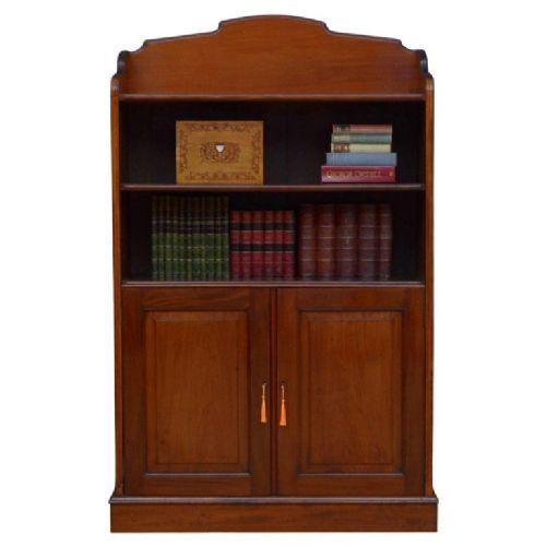 Late 19th Century (circa 1880) Victorian antique solid mahogany open bookcase, having shaped gallery to the top with moulded edge and height adjustable shelf above a pair of panelled cupboard door fitted with working locks and two keys and enclosing height adjustable shelves, all standing on plinth base. This antique bookcase is in home ready condition.