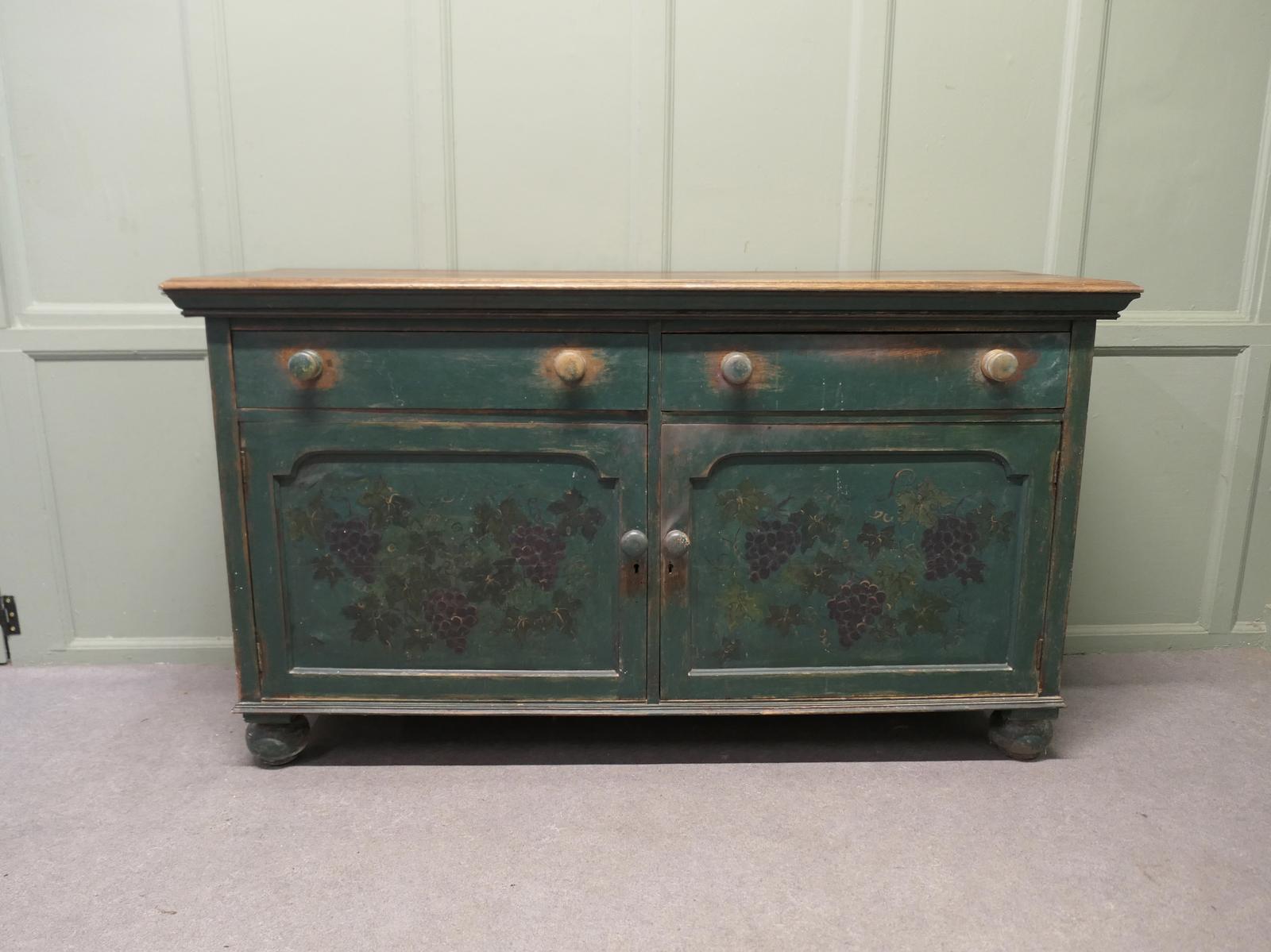 The sideboard is in good sound condition it has not been stripped or painted, the green painted finish with bunches of grapes is as old as the dresser, the top has a waxed finish there are no loose joints and the drawers run well.