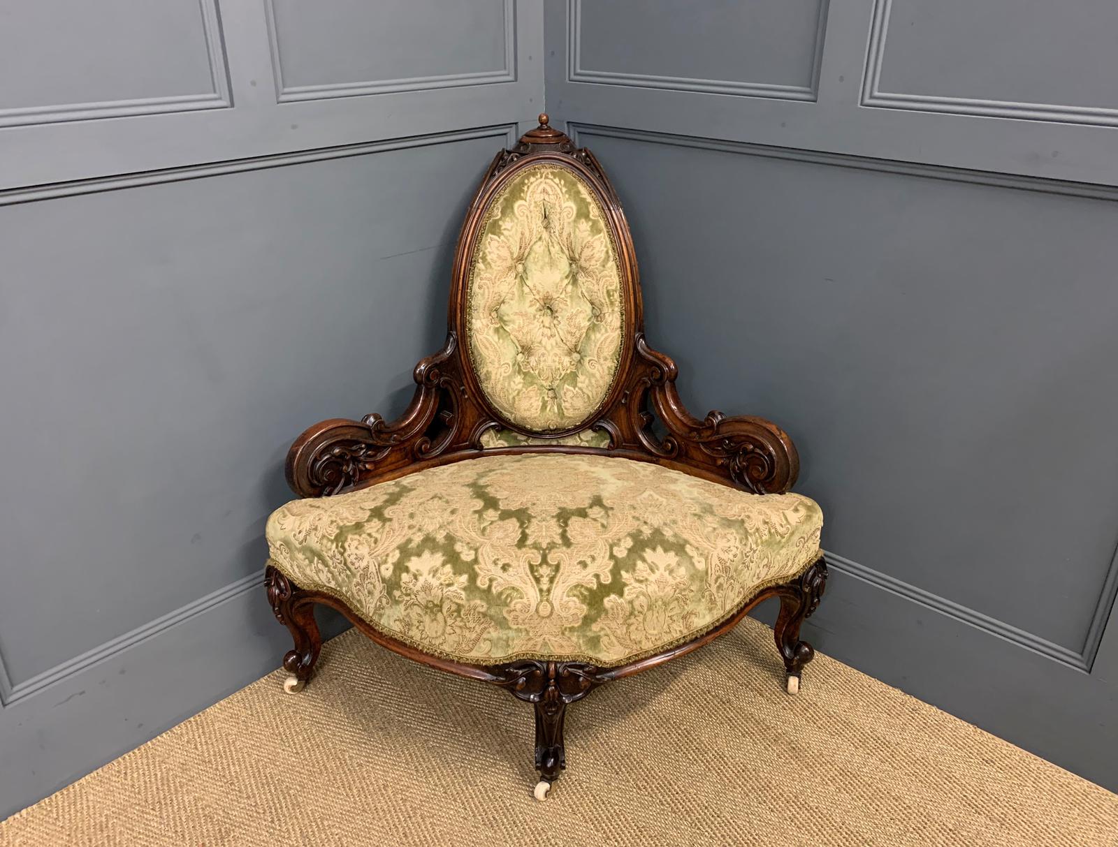 Victorian Ornate Carved Walnut Upholstered Corner Chair