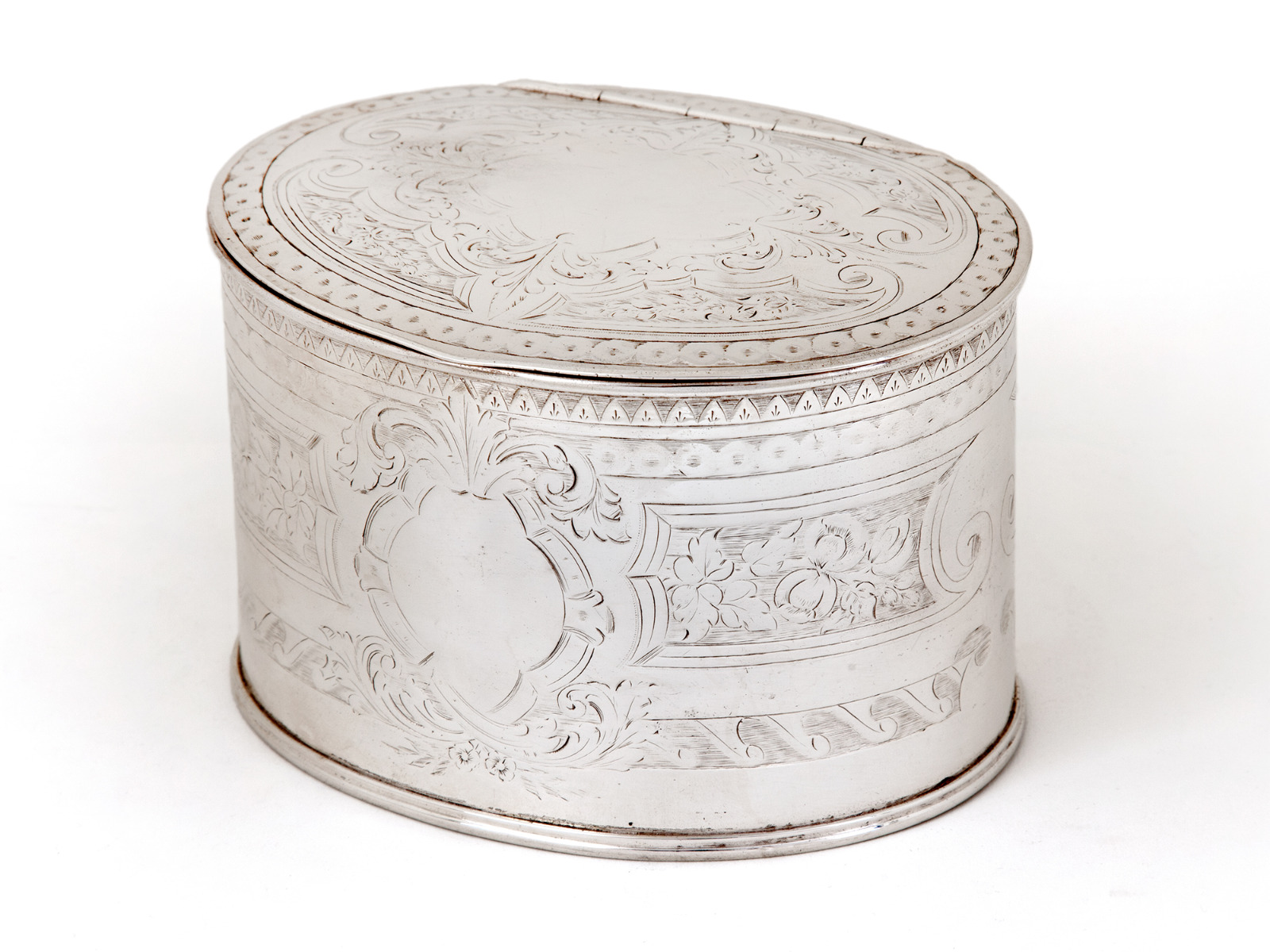 Victorian Oval Silver Plated Tea Caddy with Scroll & Floral Engraving & Empty Cartouche