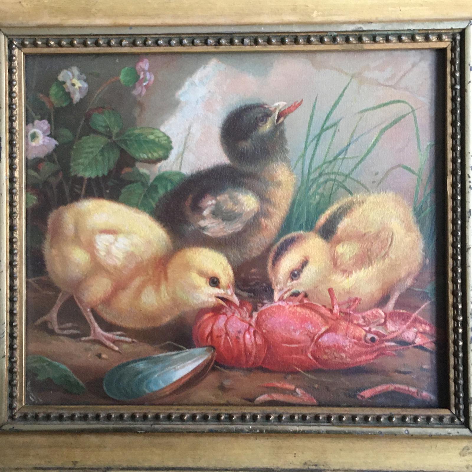 Victorian Paint of Three Chicks Eating the Leftovers from the Seafood Course