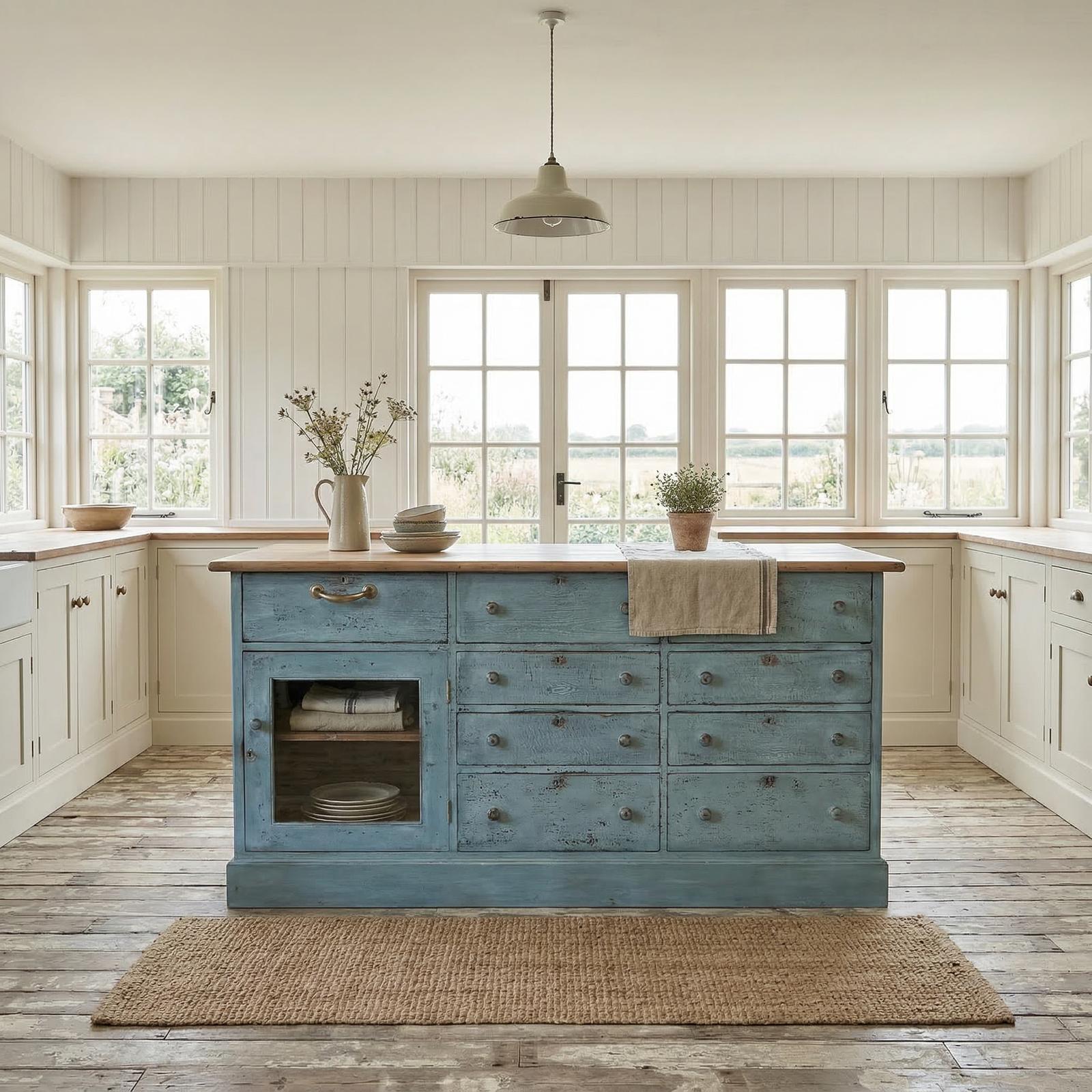 Having a small glazed cupboard to one end and a total of 9 drawers, 8 having turned wooden knobs and one larger drawer having a brass handle and compartments, perfect for cutlery and utensils.