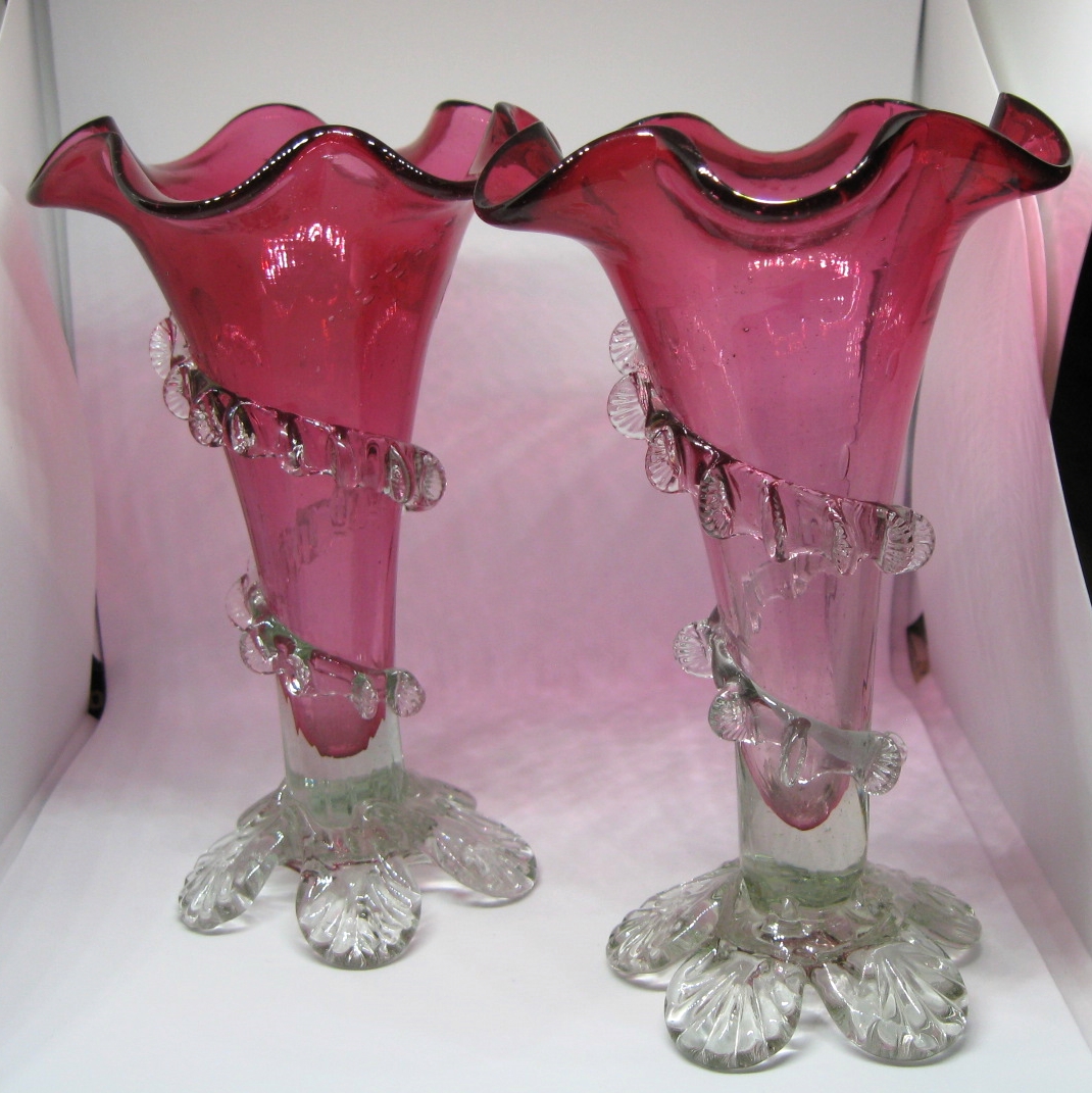 Victorian Pair of Cranberry Glass Vases On Clear Shell Feet