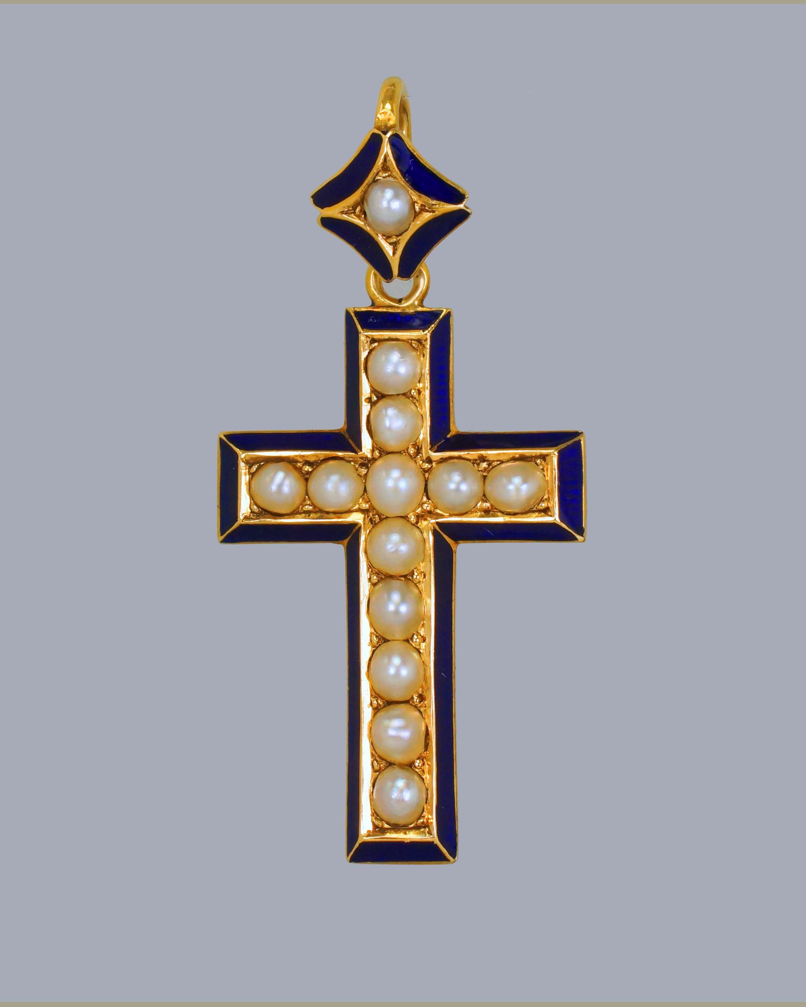 Victorian Pearl & Blue Enamel Crucifix Pendant 18ct Gold Antique Cross c.1900