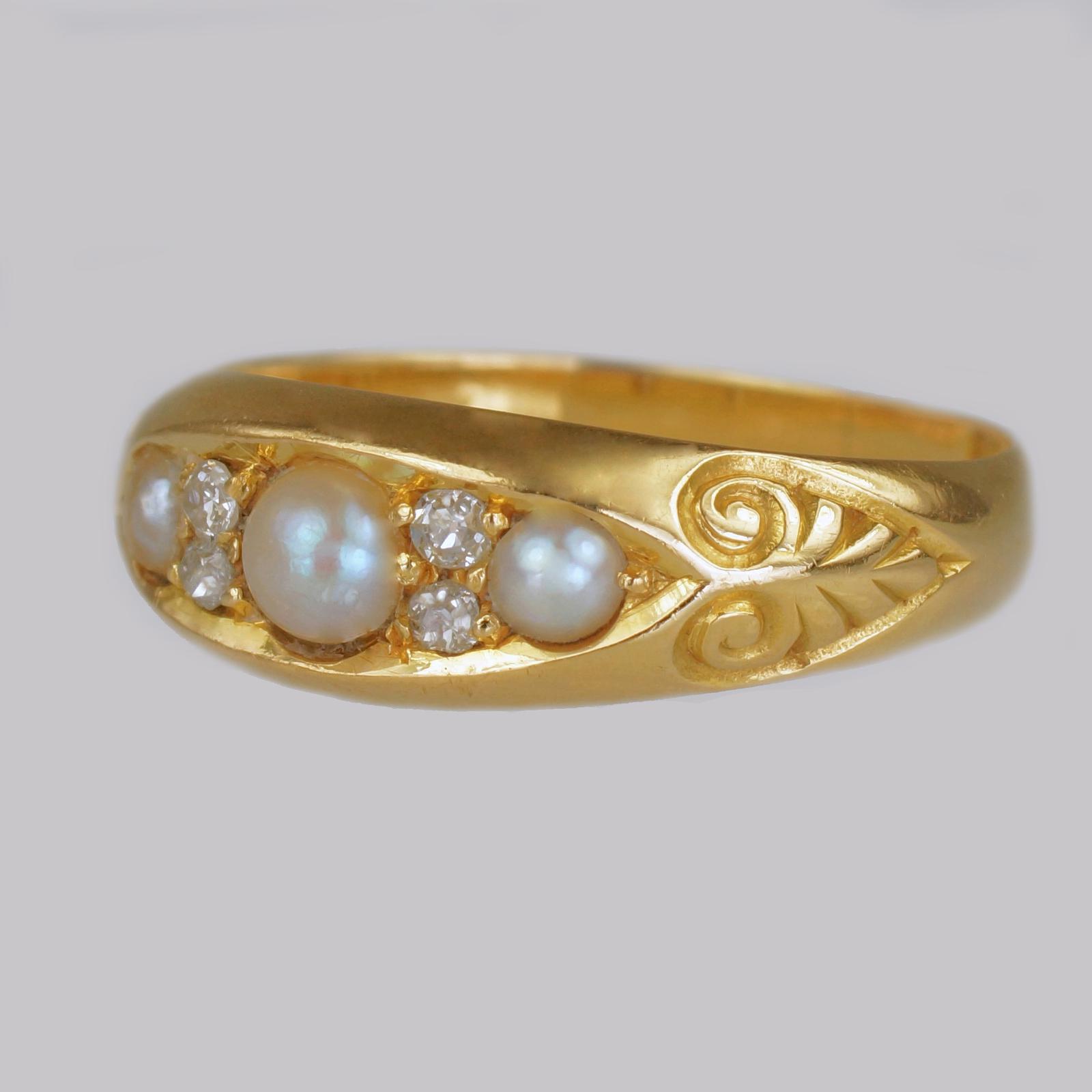 Victorian Pearl & Old Cut Diamond 18ct Gold Antique Boat Ring Birmingham 1894