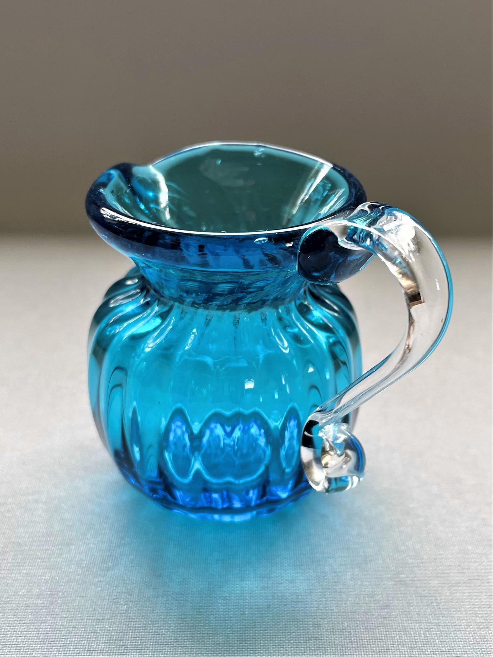 A charming late 19th century glass cream jug, in the sought after 'petrol blue' colourway. The body is rounded with optic ribbing and a dimpled base. The applied handle is clear glass with a lovely 'kick' at the foot.