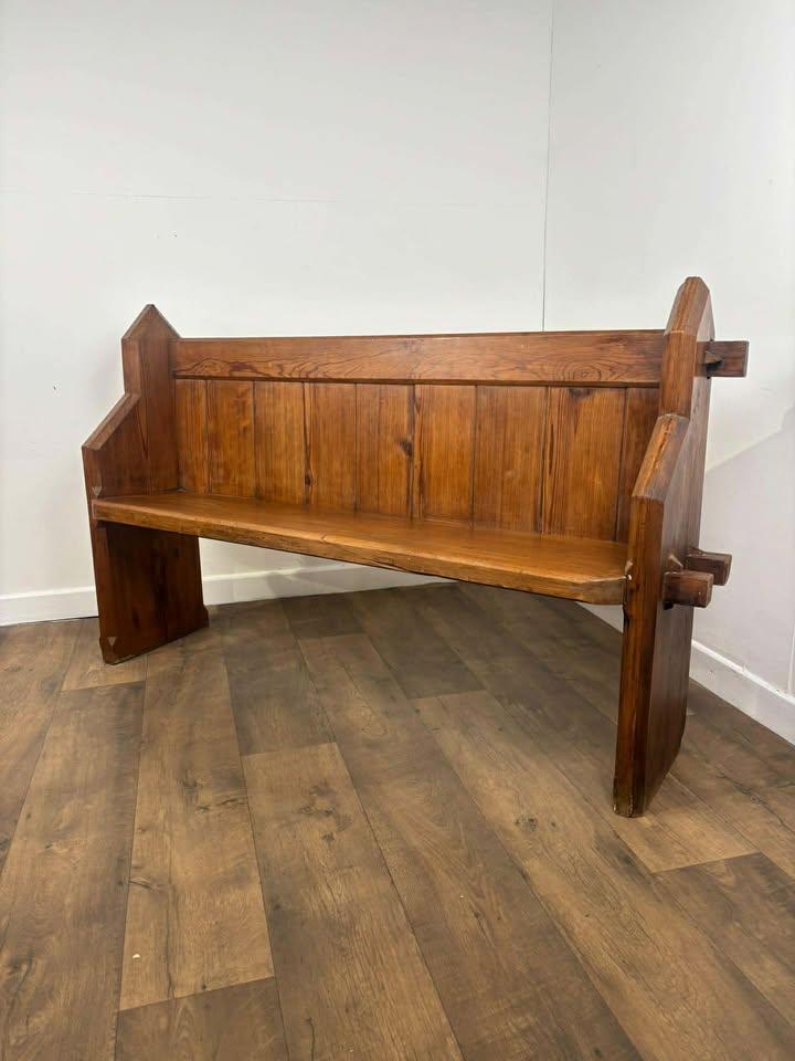 The pew features shaped ends with visible pegged construction and a pleasing aged patina developed over many years of use.