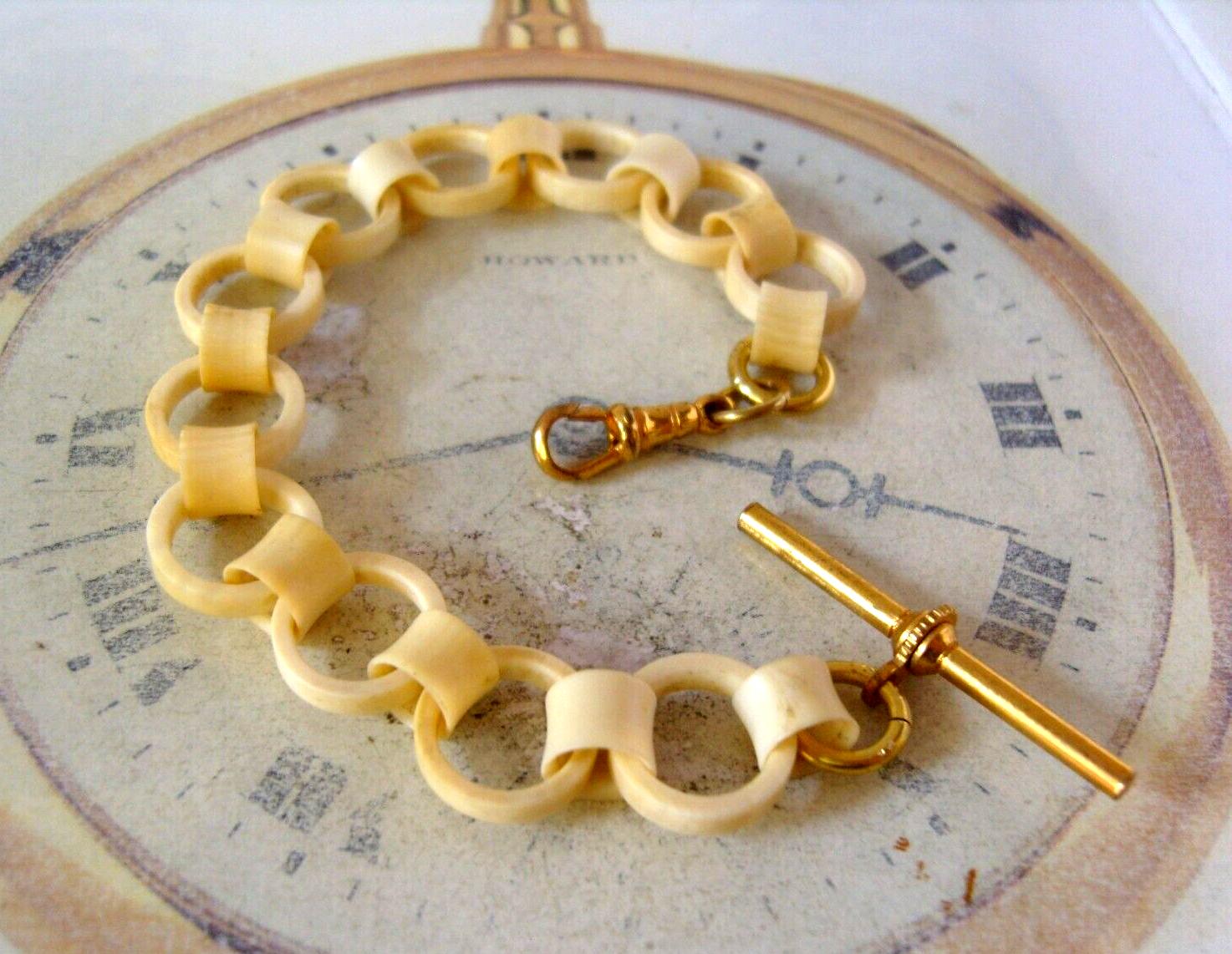 Victorian Pocket Watch Chain 1890s Antique Gilt & Faux Bone Albert With T Bar