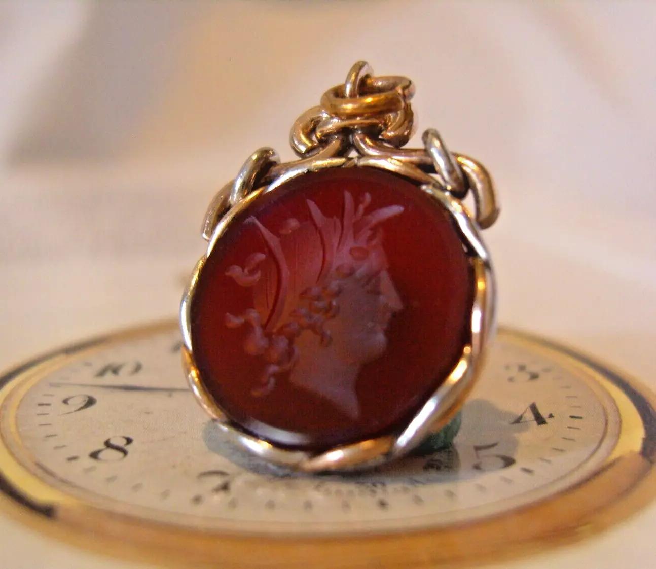 Victorian Pocket Watch Chain Fob 10ct Rose & White Gold Filled 1890s Intaglio Fob