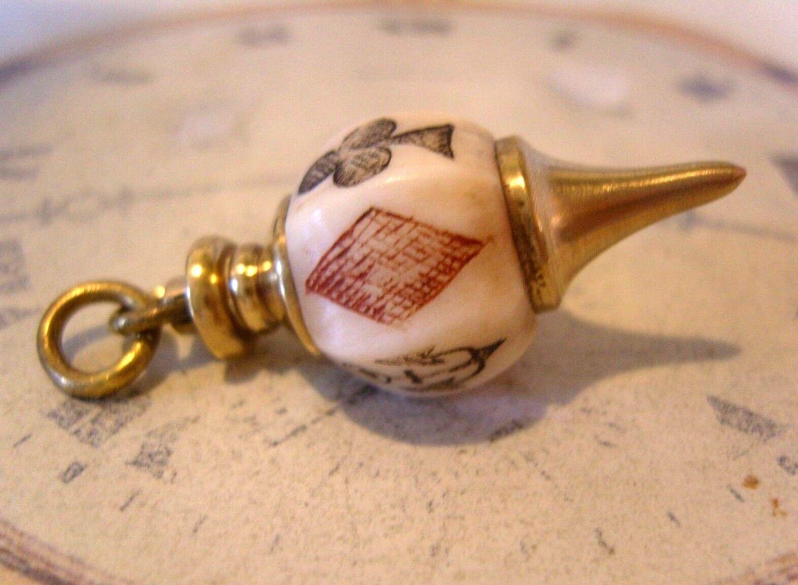 Victorian Pocket Watch Chain Gambling Fob 1890s Large Brass & Bovine Bone Spinner Fob