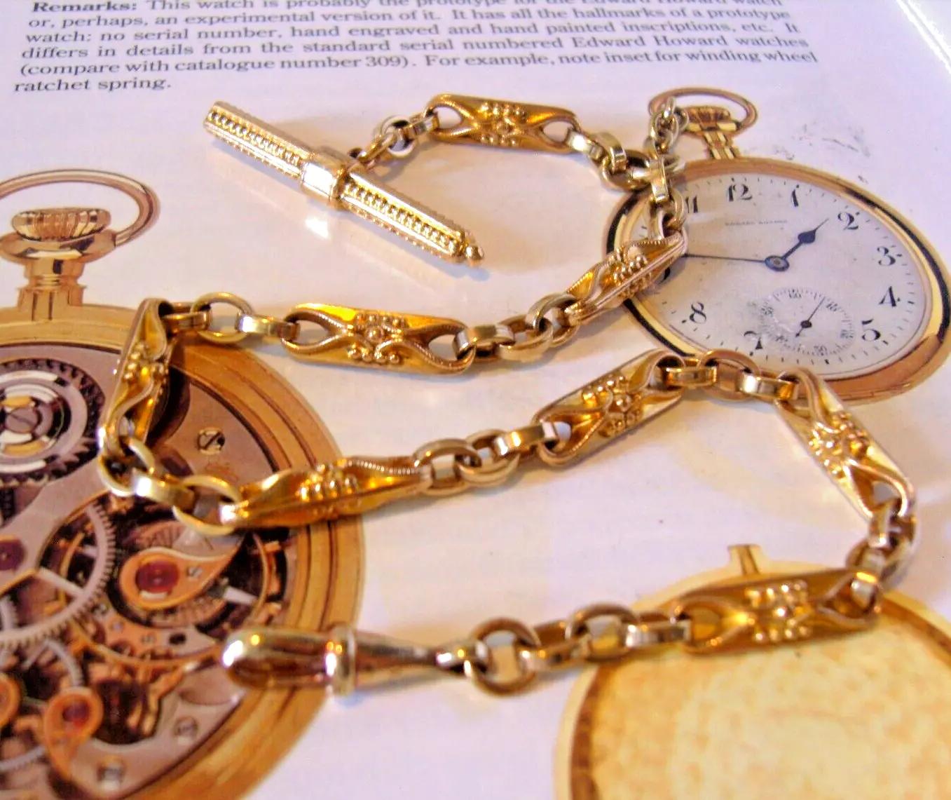 Victorian Pocket Watch Chain Large 1890s Brass & Gilt Fancy Albert With T Bar