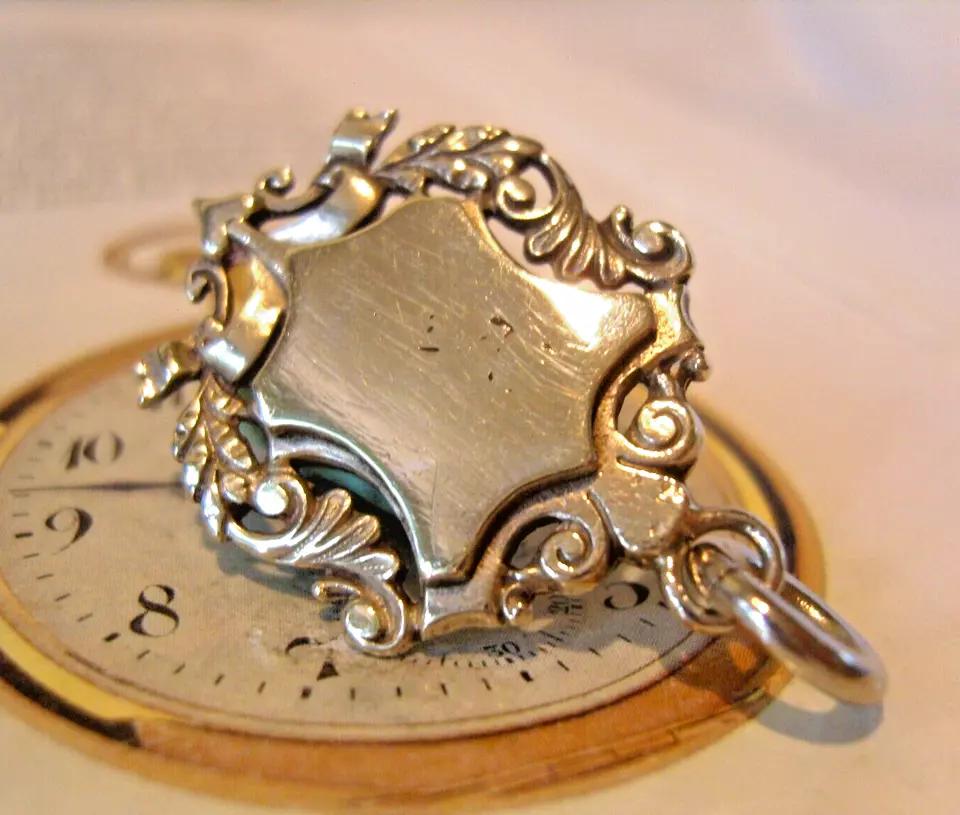 Victorian Pocket Watch Chain Shield Fob Antique 1890s Ornate Silver Nickel Fob